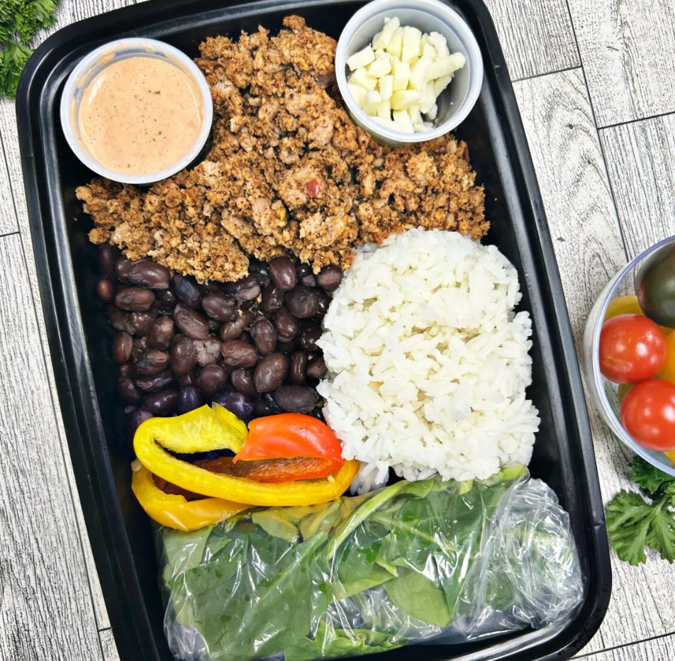 Taco Turkey: A seasoned turkey bowl made with rice, beans, and fresh vegetables for a balanced, high-protein meal.