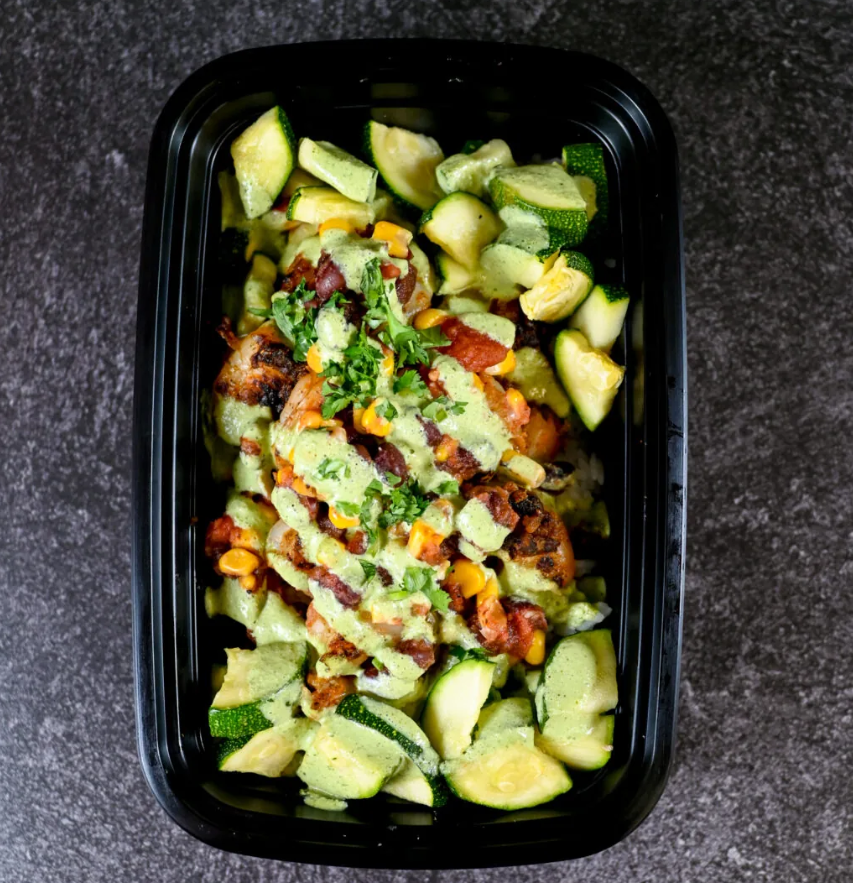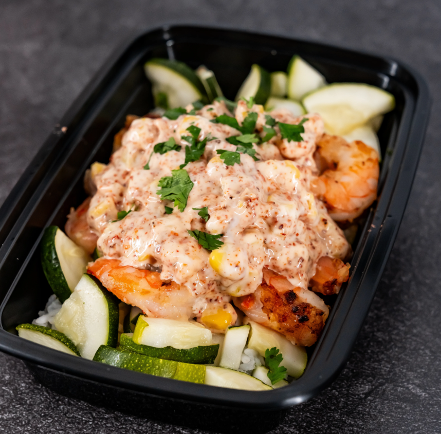 Cilantro Taco Shrimp Bowl: Seasoned shrimp paired with corn salsa, zucchini, rice, and black beans, finished with cilantro lime sauce for a refreshing, balanced meal.