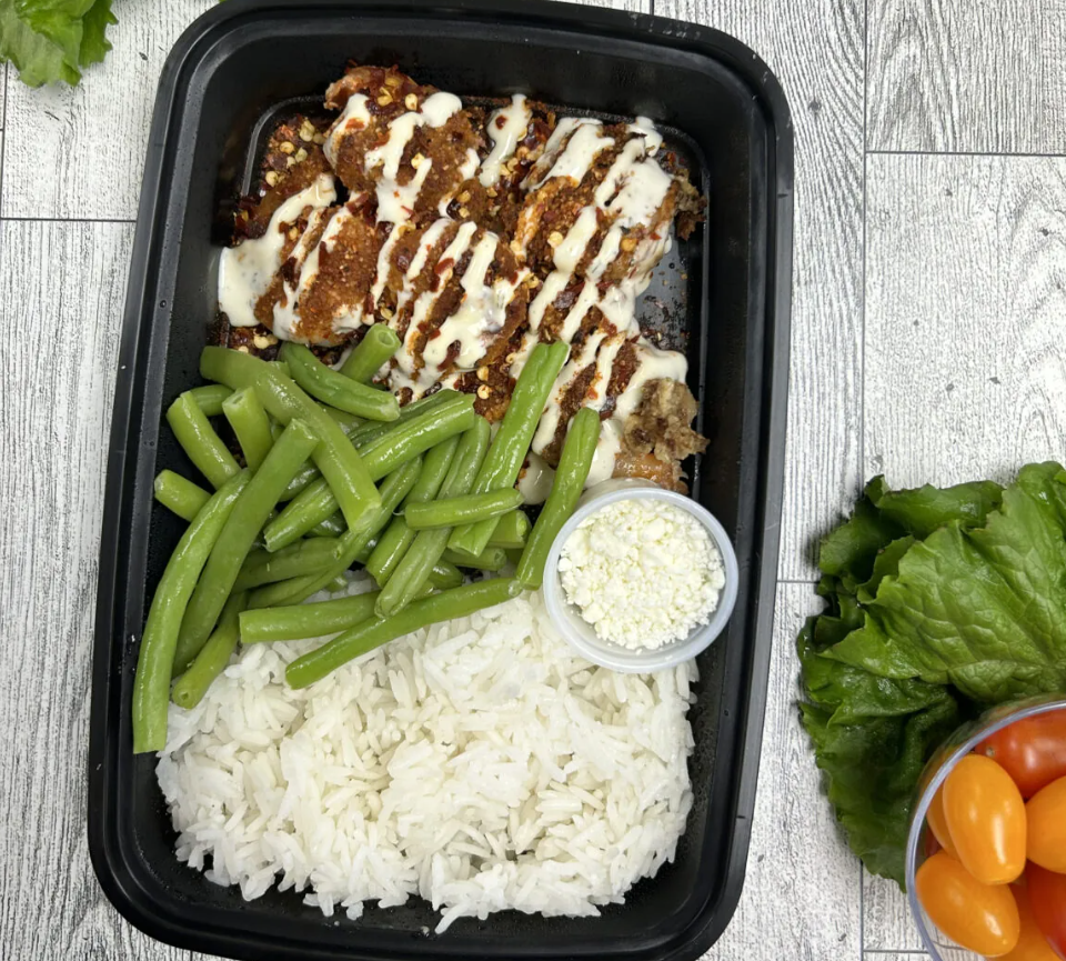 Firecracker Shrimp: A bold, spicy shrimp dish served over jasmine rice and green beans, topped with feta and house ranch for a satisfying kick.