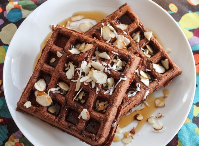 OUR YUMMY WAFFLES TOPPED WITH COCONUT FLAKES, SUGAR FREE CHOCOLATE SYRUP SHAVED ALMONDS AND CHOCOLATE CHIPS