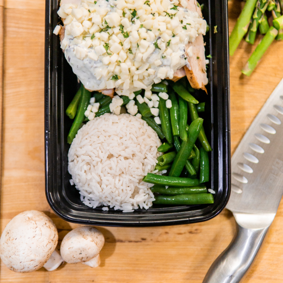 Grilled chicken breast topped with artichoke pesto sauce, jasmine rice, broccoli, and mozzarella