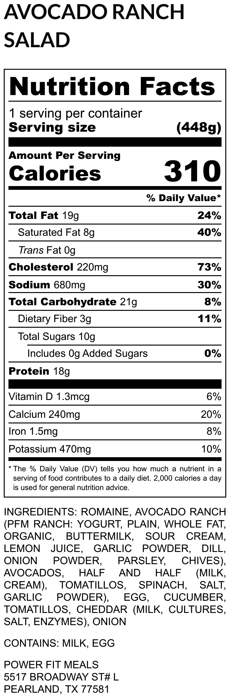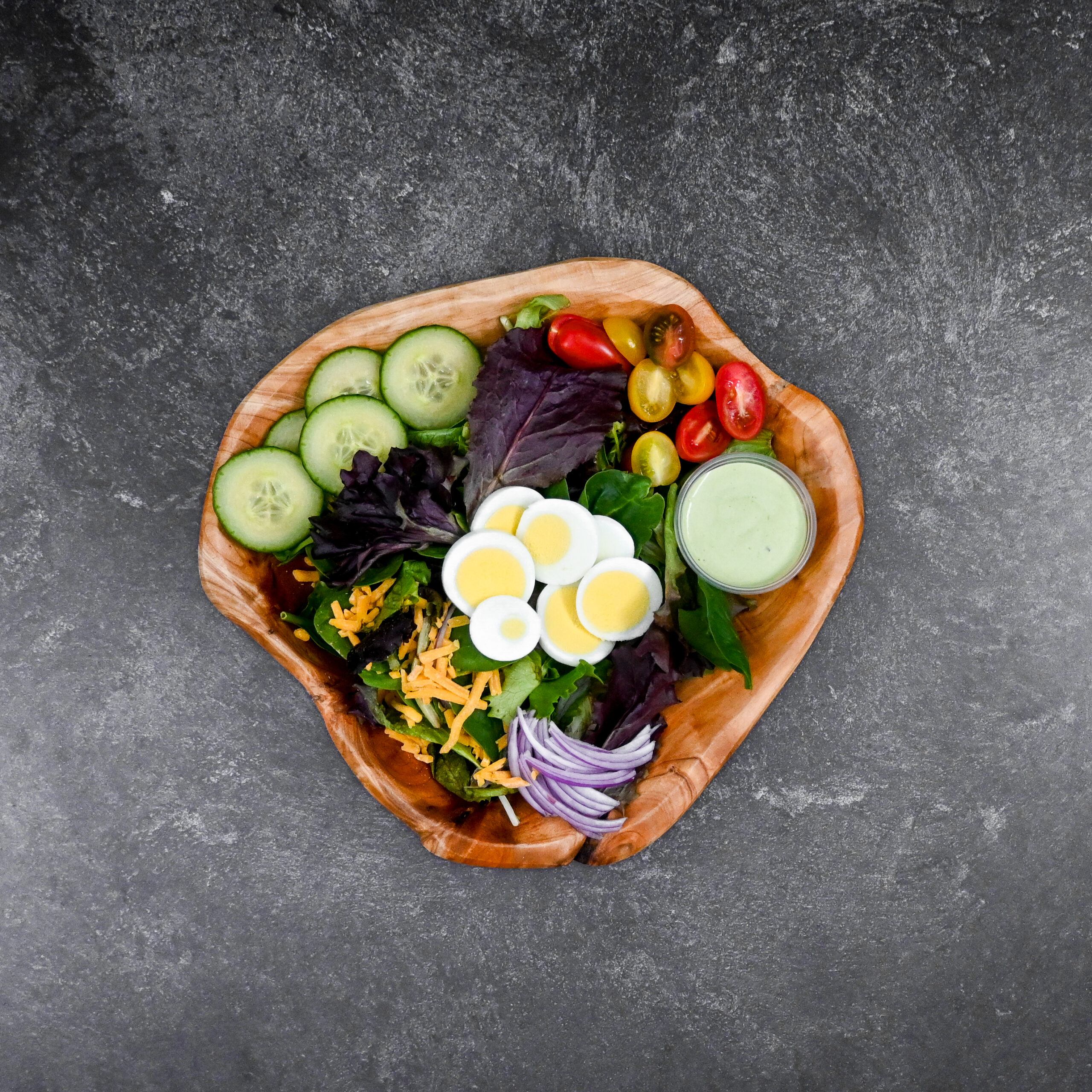 OUR VERSION OF A HOUSE SALAD! THIS DELICIOUS SALAD BASE COMES WITH AVOCADO RANCH, SPRING MIX, BOILED EGGS, RED ONIONS, TOMATOES, CUCUMBERS, AND CHEDDAR CHEESE.