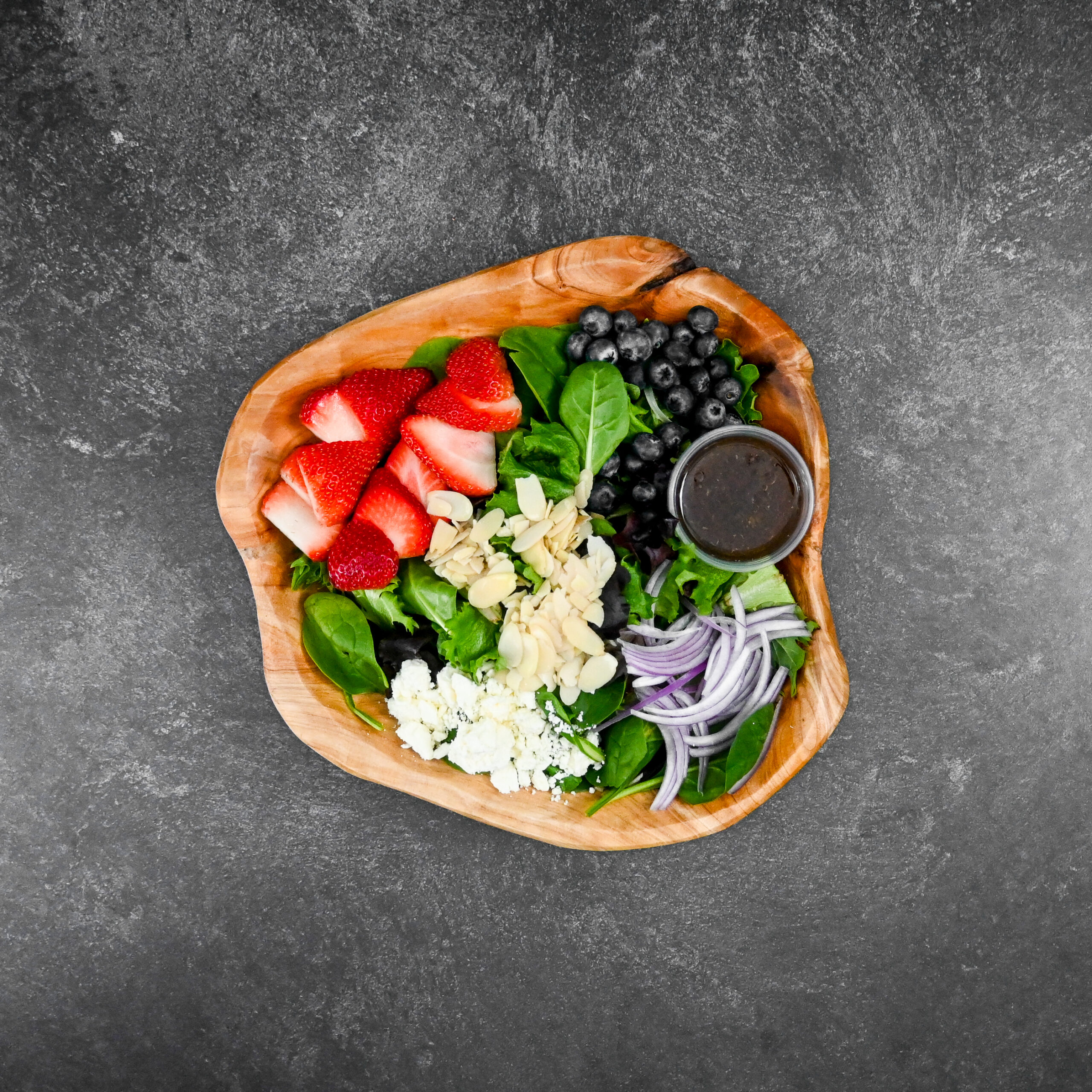 Spinach mix base with blueberries, feta, almonds, red onions and balsamic dressing on the side!