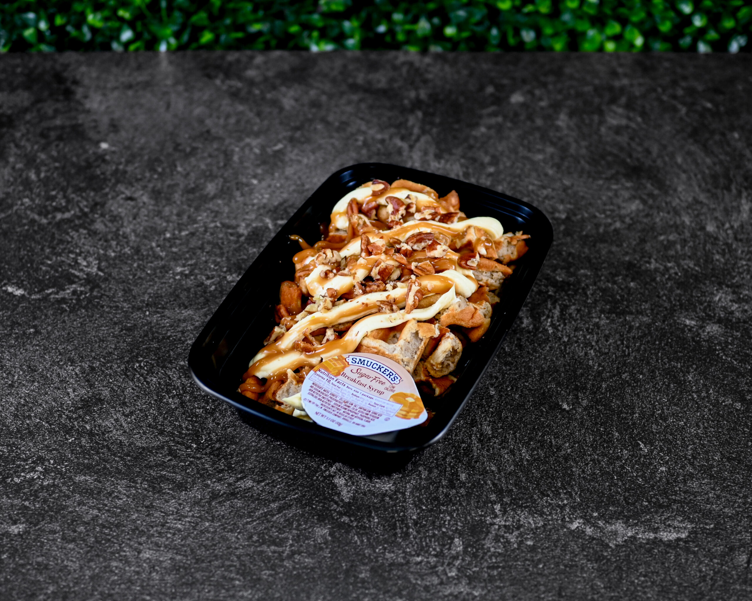 OUR FLUFFY PROTEIN WAFFLE SERVED WITH BANANA CREAM, SUGAR FREE CARAMEL, PECANS AND SUGAR FREE SYRUP