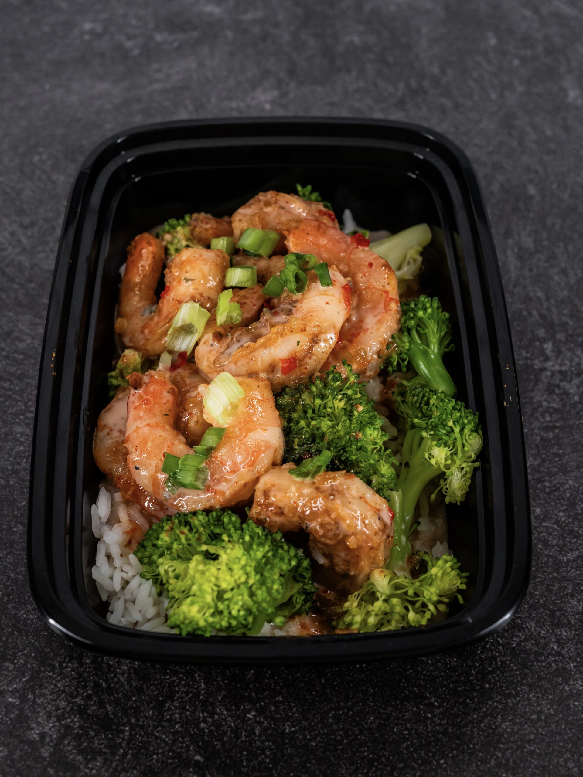 TENDER GRILLED SHRIMP TOPPED WITH OUR CREAMY SWEET AND SPICY BANG BANG SAUCE SERVED WITH RICE AND BROCCOLI!