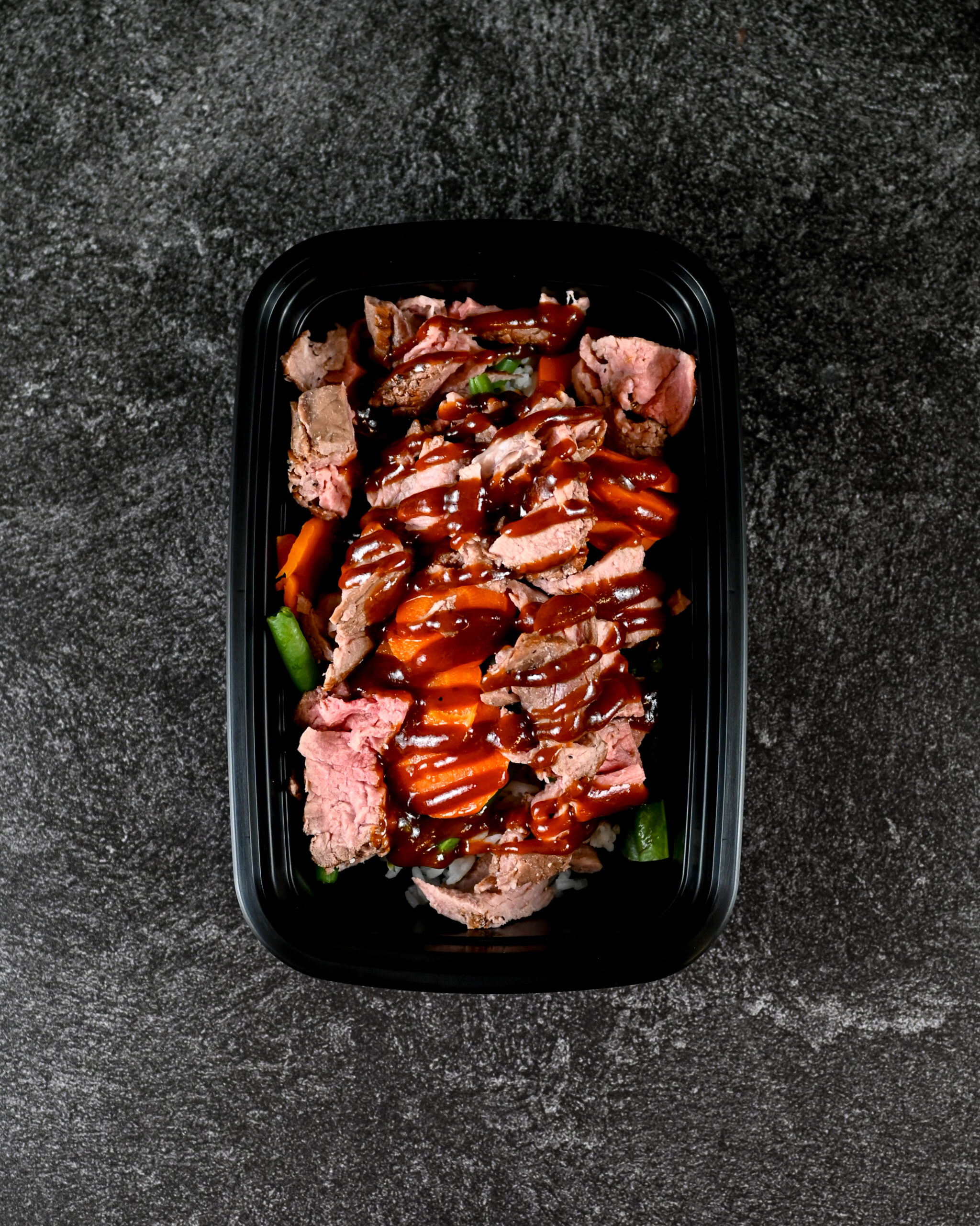 LEAN GRASS FED SIRLOIN WITH BBQ SAUCE, JASMINE RICE, BLACK BEANS, CARROTS, AND GREEN BEANS!