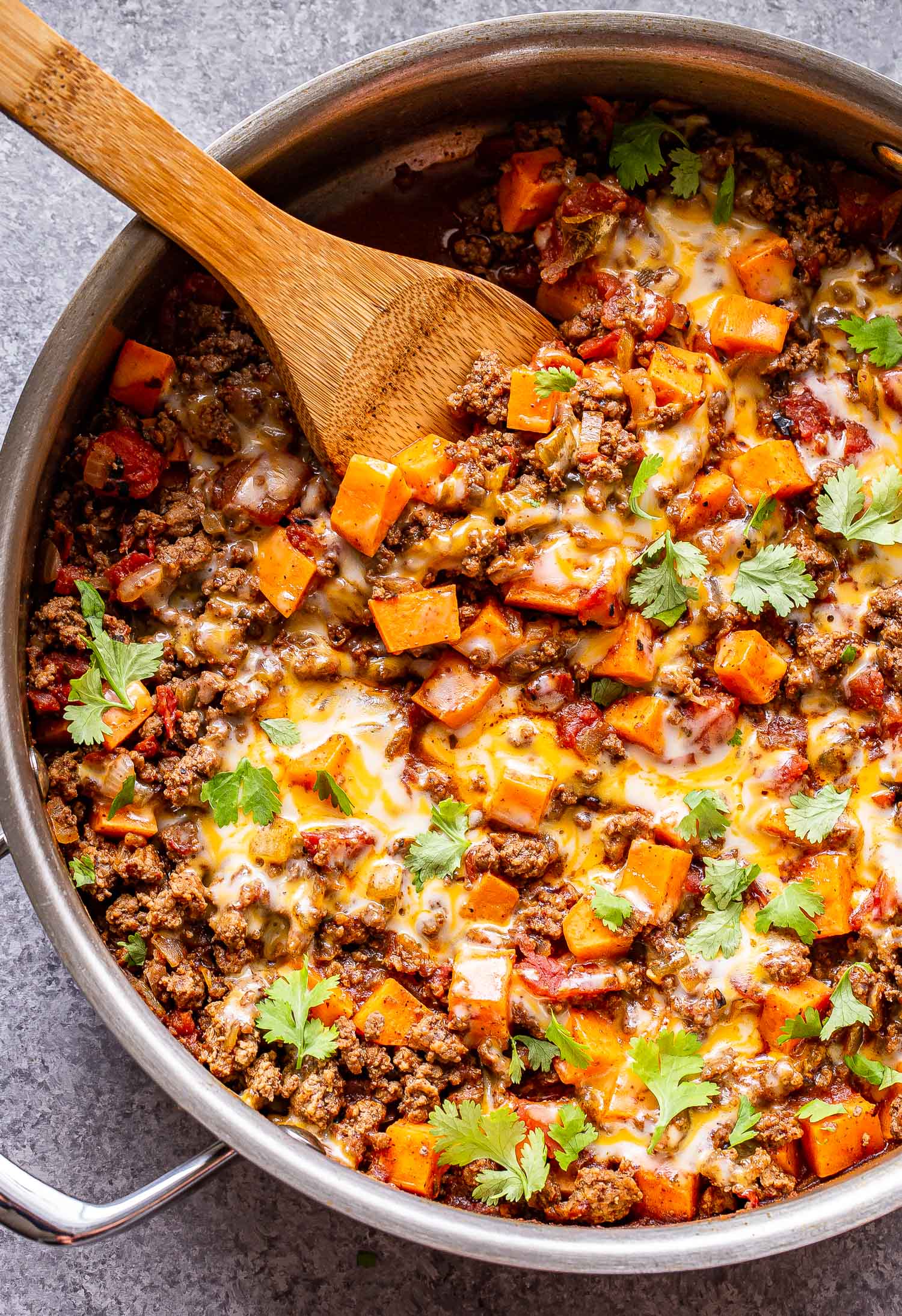 SWEET POTATOES TOPPED WITH BLACK BEANS, TACO BEEF, CHEDDAR AND PICO DE GALLO DRIZZLED WITH OUR SIGNATURE AVOCADO RANCH.