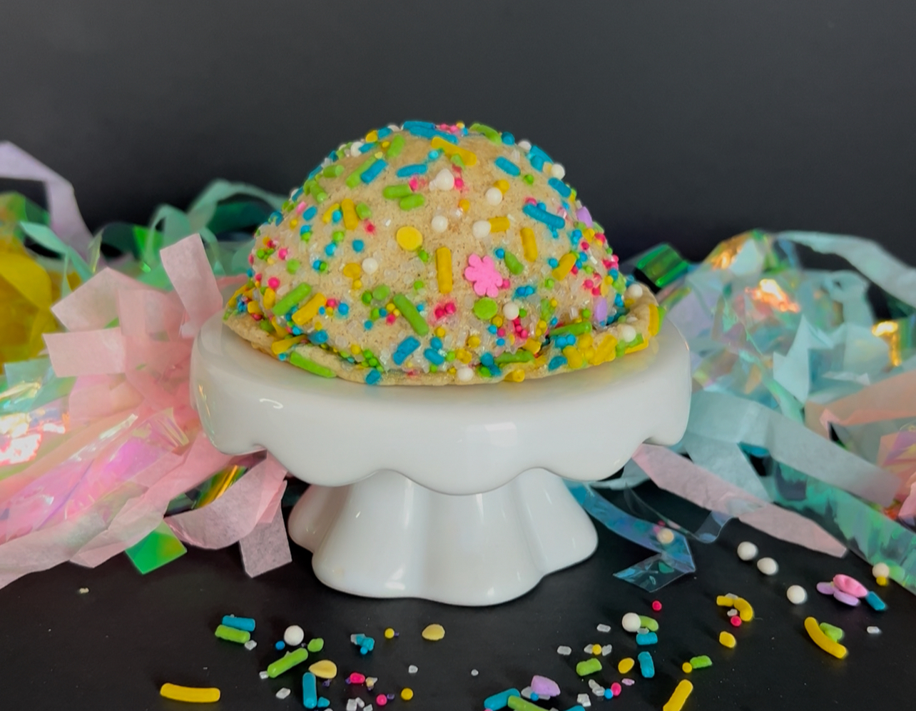 Cake batter cookie dough swirled with luscious purple protein frosting, wrapped around a surprise Funfetti cupcake center (yes, an actual cupcake), and rolled in a garden of blooming pastel sprinkles. It’s sweet, whimsical, and unapologetically over-the-top.