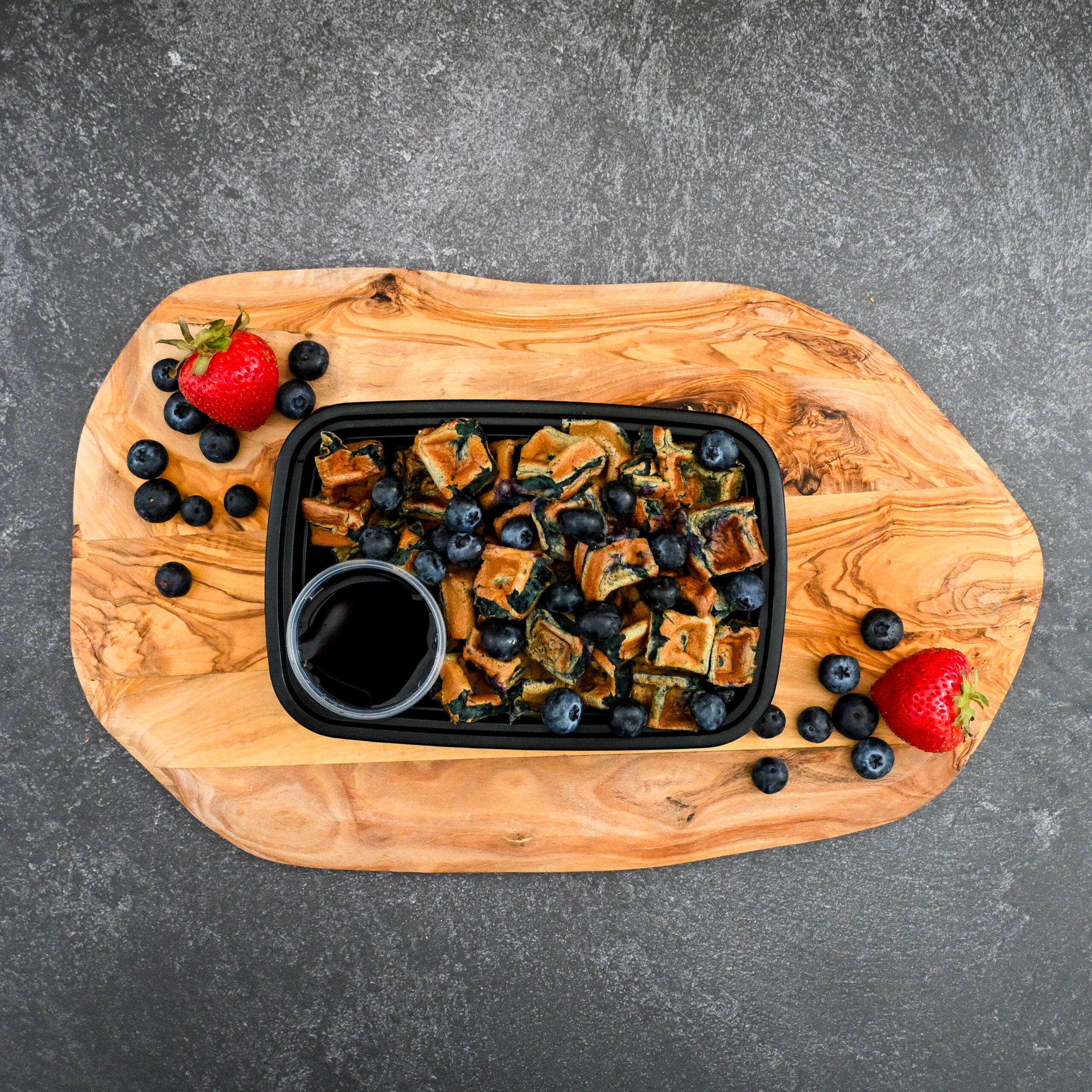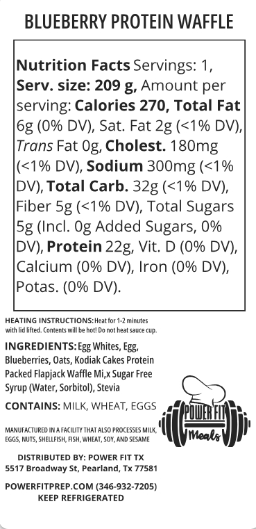 OUR YUMMY PROTEIN WAFFLES BLENDED WITH BLUEBERRIES, TOPPED WITH MORE, AND SERVED WITH SUGAR FREE SYRUP!