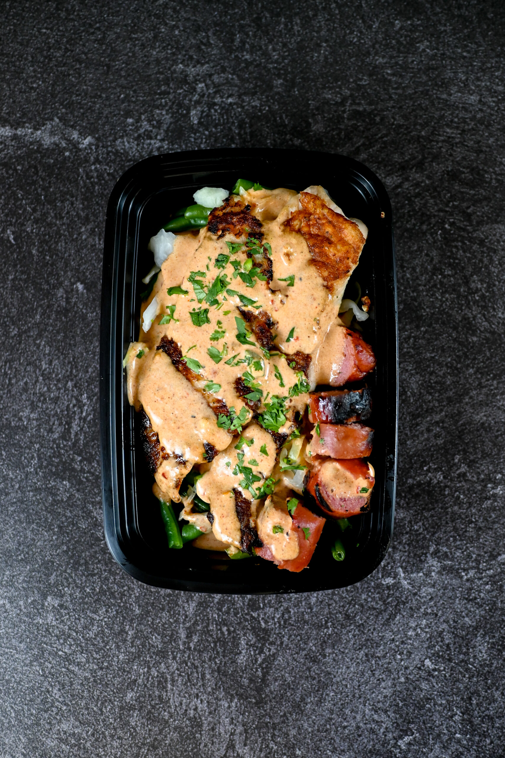FLAKY WHITE FISH & TURKEY SAUSAGE TOPPED CAJUN SAUCE. SERVED WITH RICE, CABBAGE MIX, AND GREEN BEANS