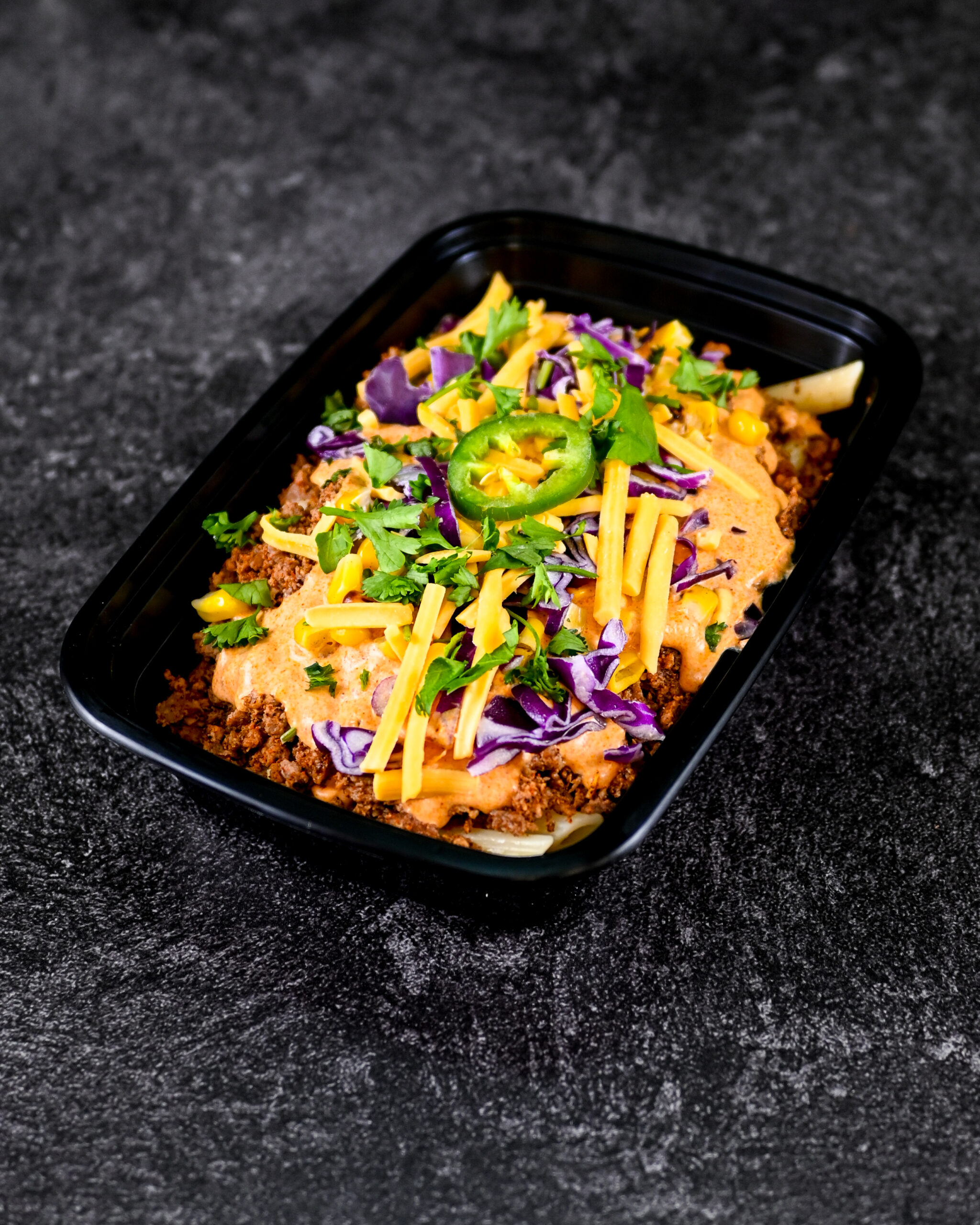 Savory taco beef with penne pasta, zucchini, and corn all smothered in a creamy enchilada sauce topped with cheddar cheese, purple cabbage, cilantro and a sliced jalapeno! 🍽️🔥