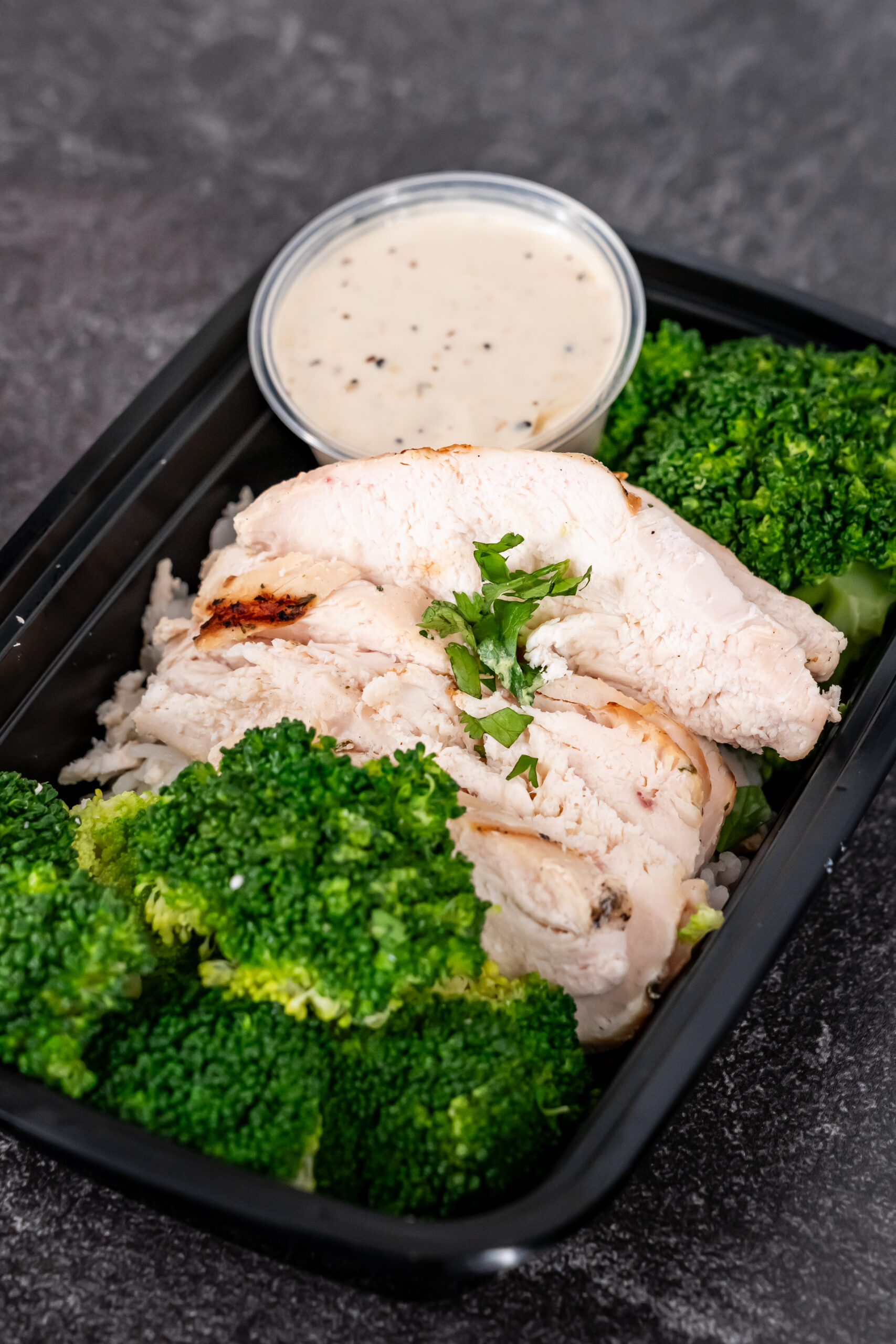 CHICKEN SERVED WITH BROCCOLI, CRISPY CHICKPEAS, RICE, AND A YUMMY CAESAR DRESSING 🍽🔥