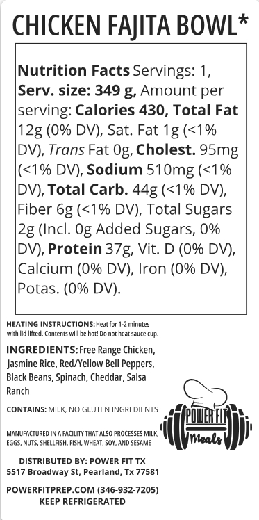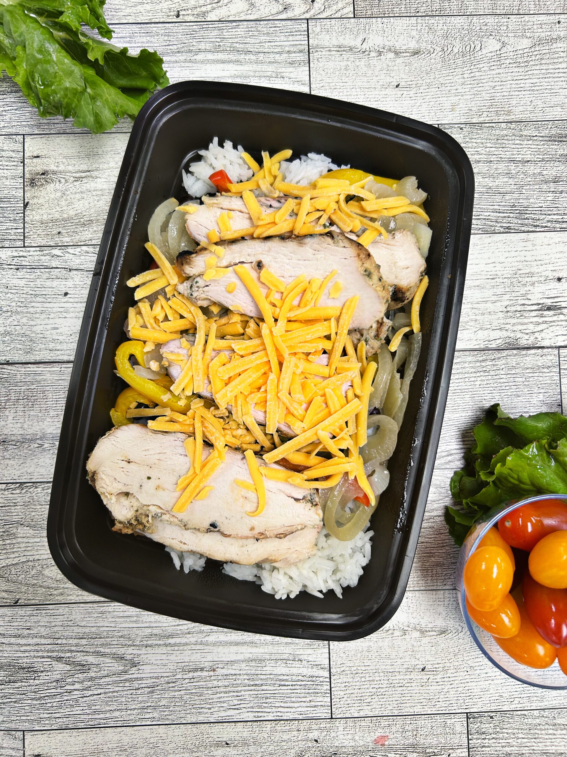 Sliced chicken breast served with jasmine rice, black beans, bell peppers, spinach, cheddar, and salsa ranch