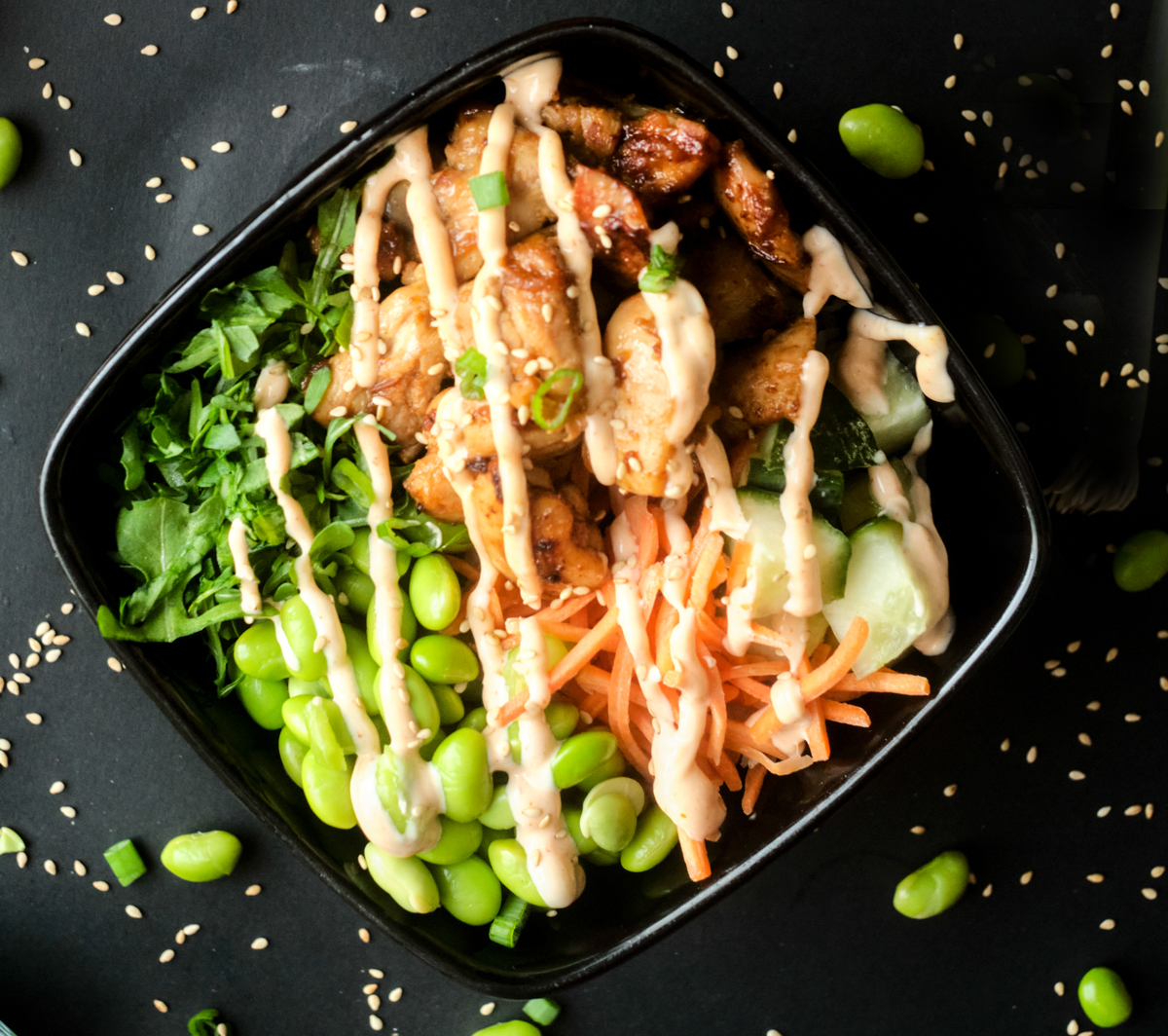 TENDER GRILLED CHICKEN SERVED WITH EDAMAME, CARROTS, CABBAGE, CUCUMBERS, TOPPED WITH TERIYAKI AND SPICY MAYO!