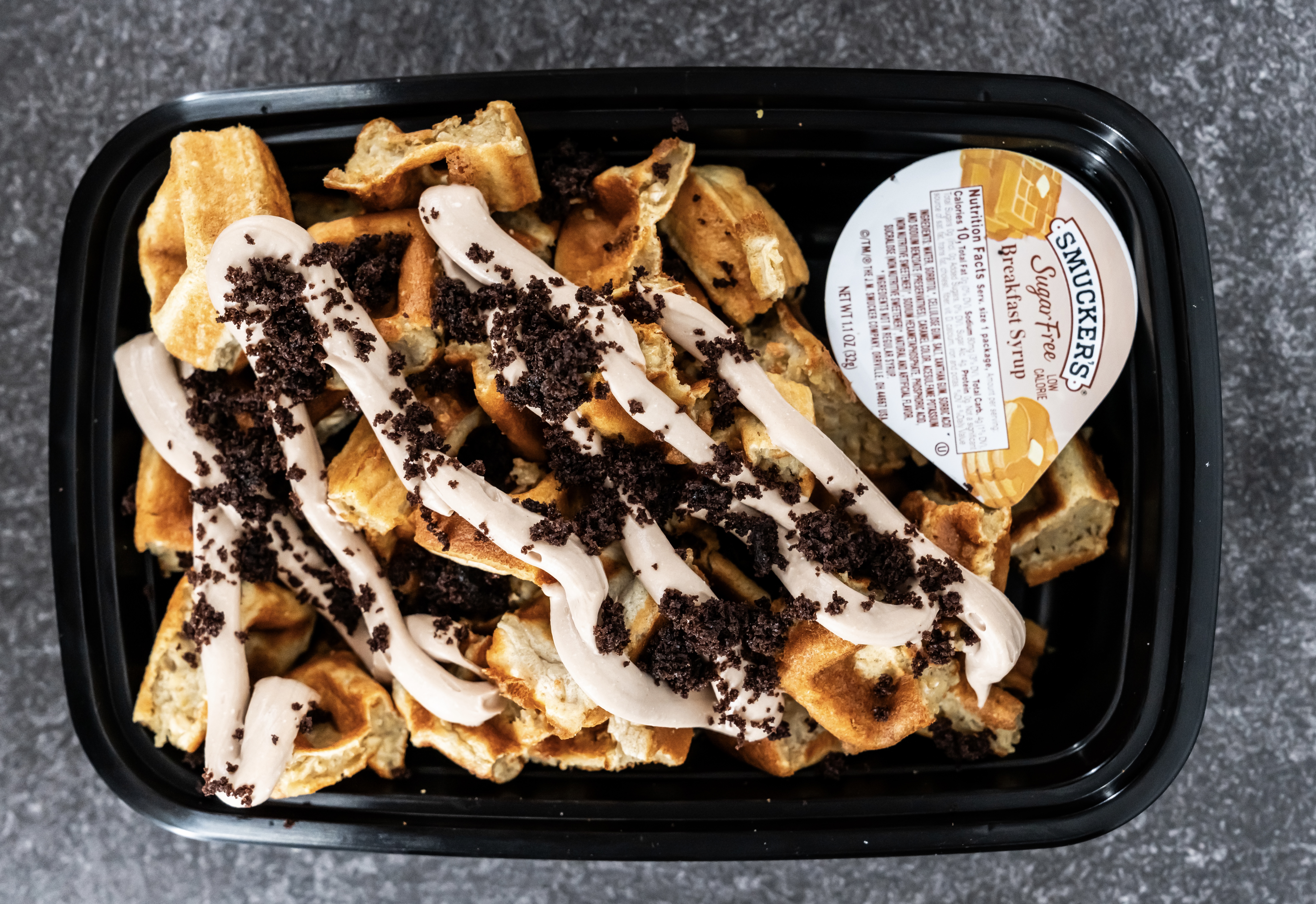 HAPPY HOLIDAYS WITHOUT THE GUILT! OUR FLUFFY WAFFLES TOPPED WITH SUGAR FREE CHOCOLATE CREAM AND PROTEIN PEPPERMINT CHOCOLATE CAKE CRUMBLE.