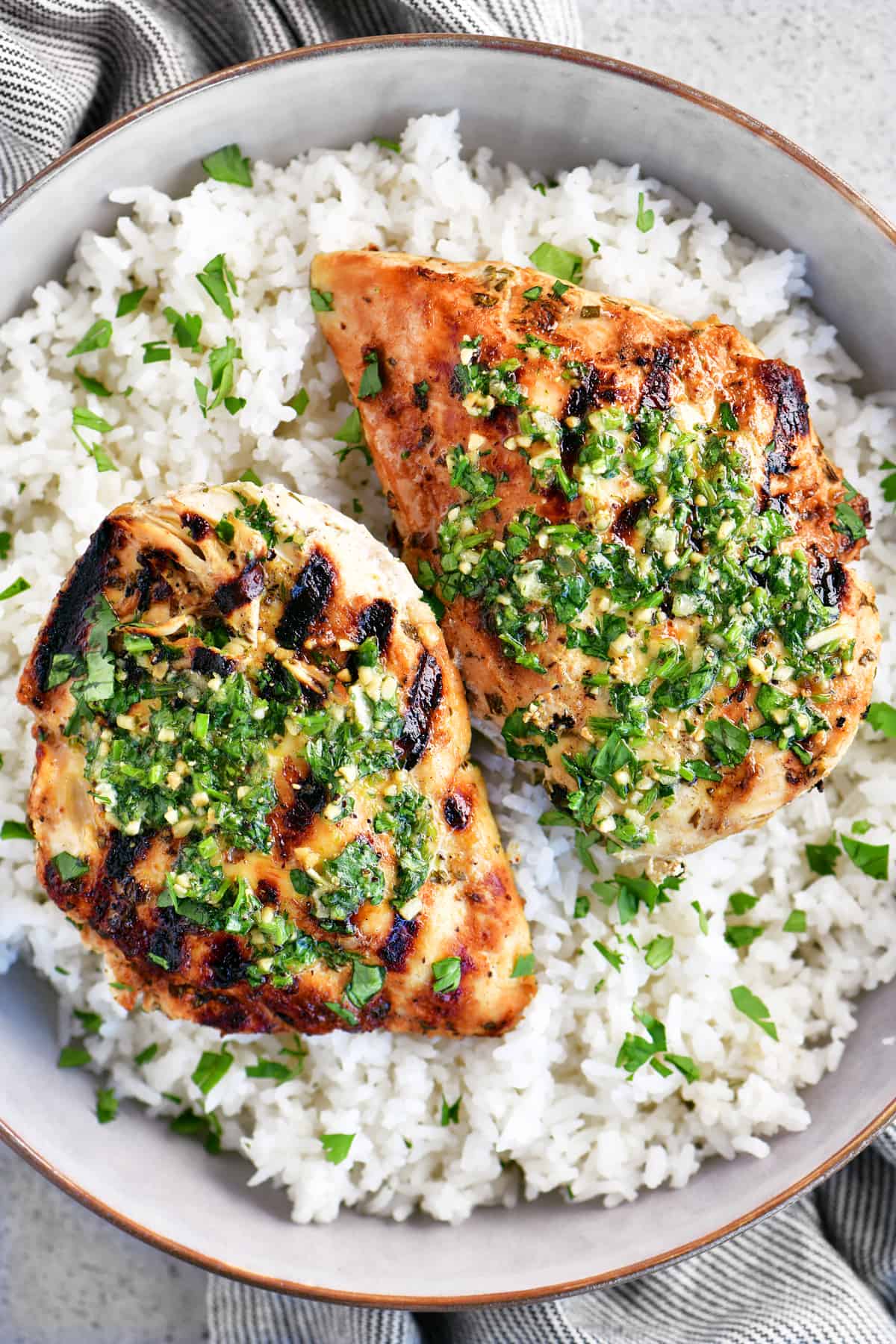 FRESH DELICIOUS CILANTRO LIME SAUCE OVER TENDER, JUICY GRILLED CHICKEN. SERVED WITH RICE, GREEN BEANS AND BELLPEPPERS!