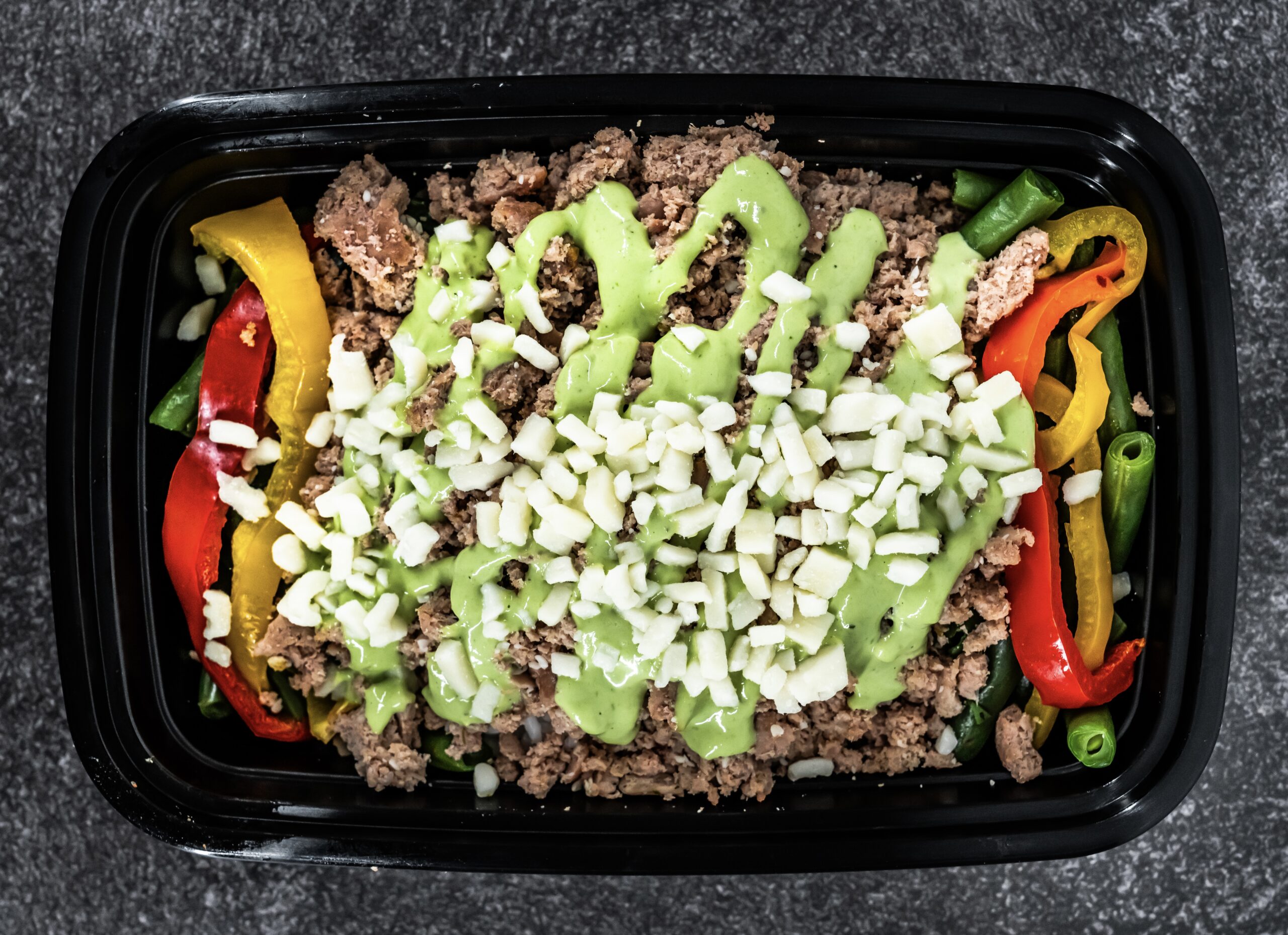 OUR SIGNAUTRE CILANTRO LIME SAUCE SERVED WITH TURKEY, RICE, GREEN BEANS AND BELL PEPPERS!