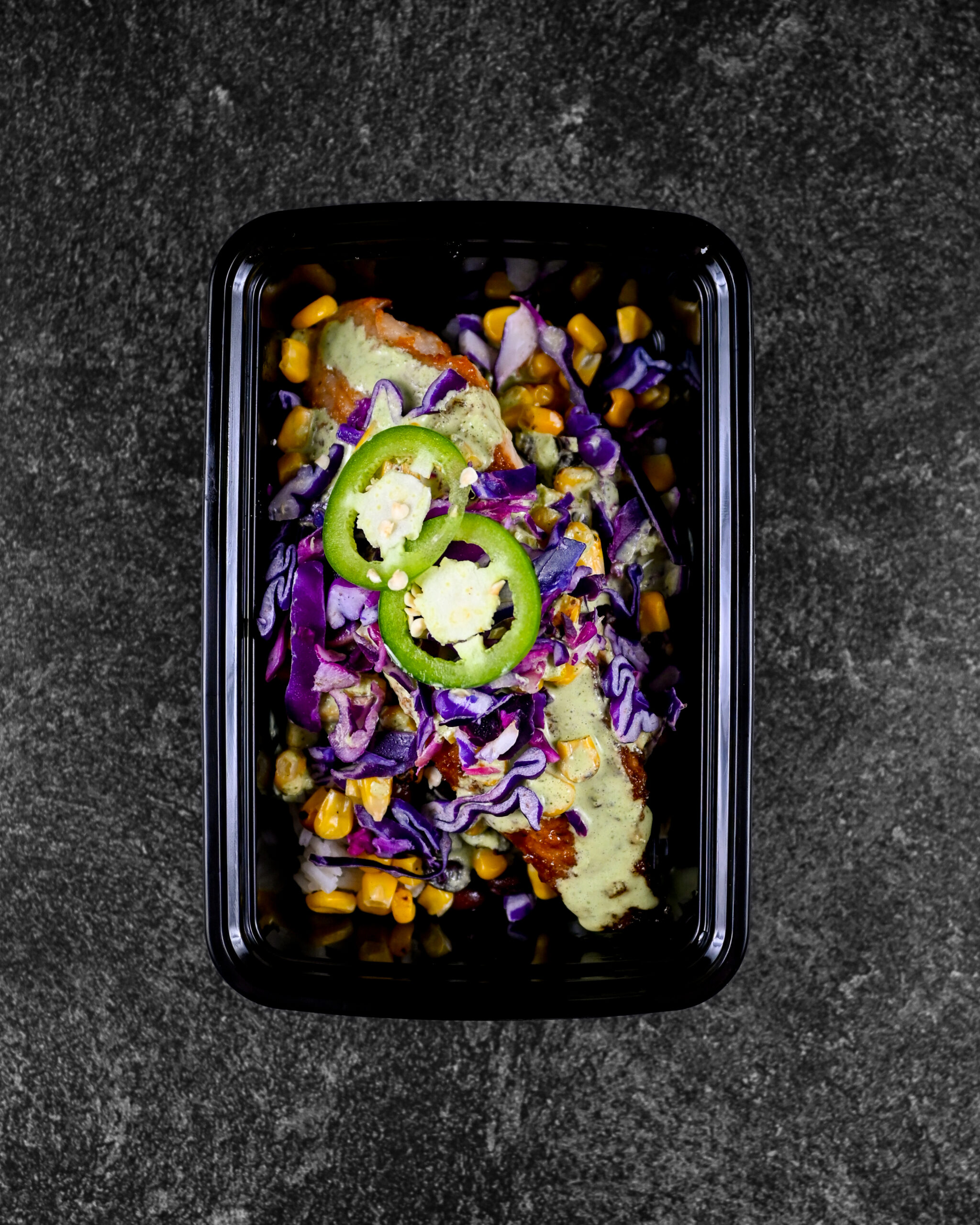 PAN SEARED WHITE FISH SERVED WITH JASMINE RICE, BLACK BEANS, CORN, JALAPENOS, PURPLE CABBAGE, AND CILANTRO LIME SAUCE.