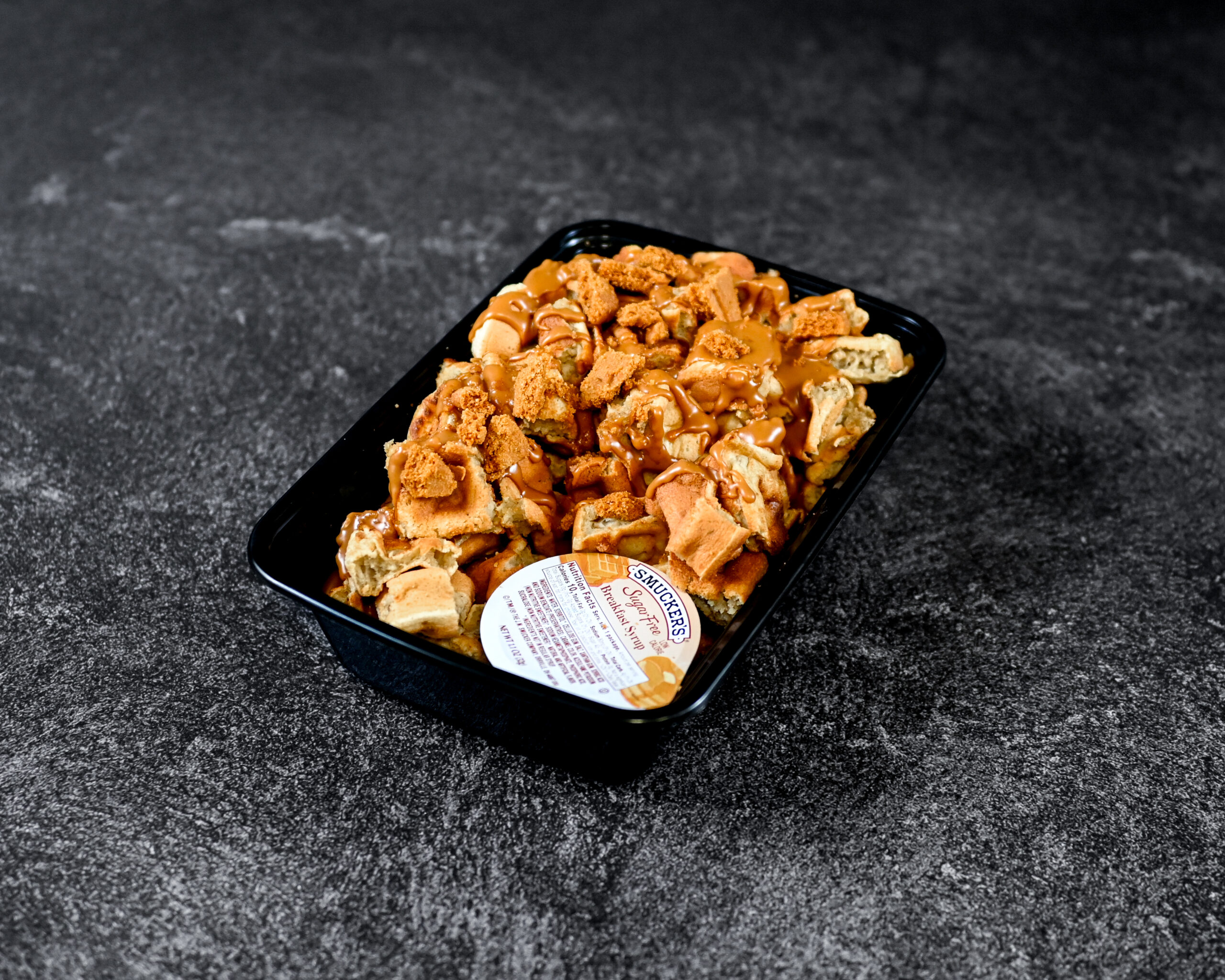OUR FLUFFY PROTEIN WAFFLE SERVED WITH BISCOFF COOKIE CRUMBS, A COOKIE BUTTER DRIZZLE AND SUGAR FREE SYRUP