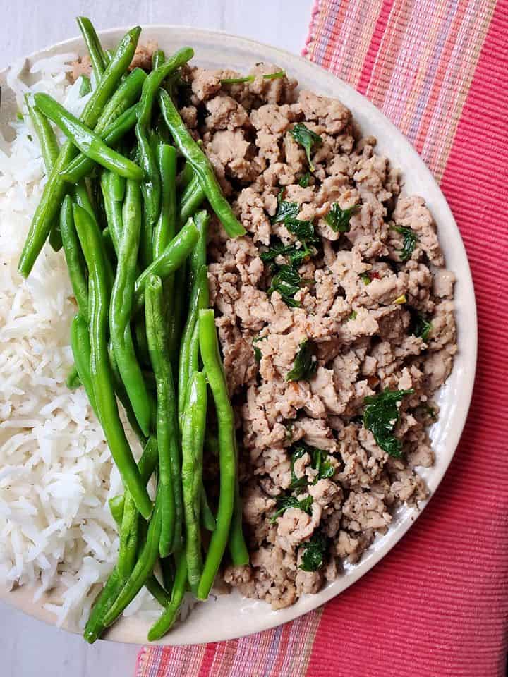 GARLIC BUTTER TURKEY SERVED WITH RICE AND GREEN BEANS TOPPED WITH OUR NEW CREAMY BLACKENED SAUCE!
