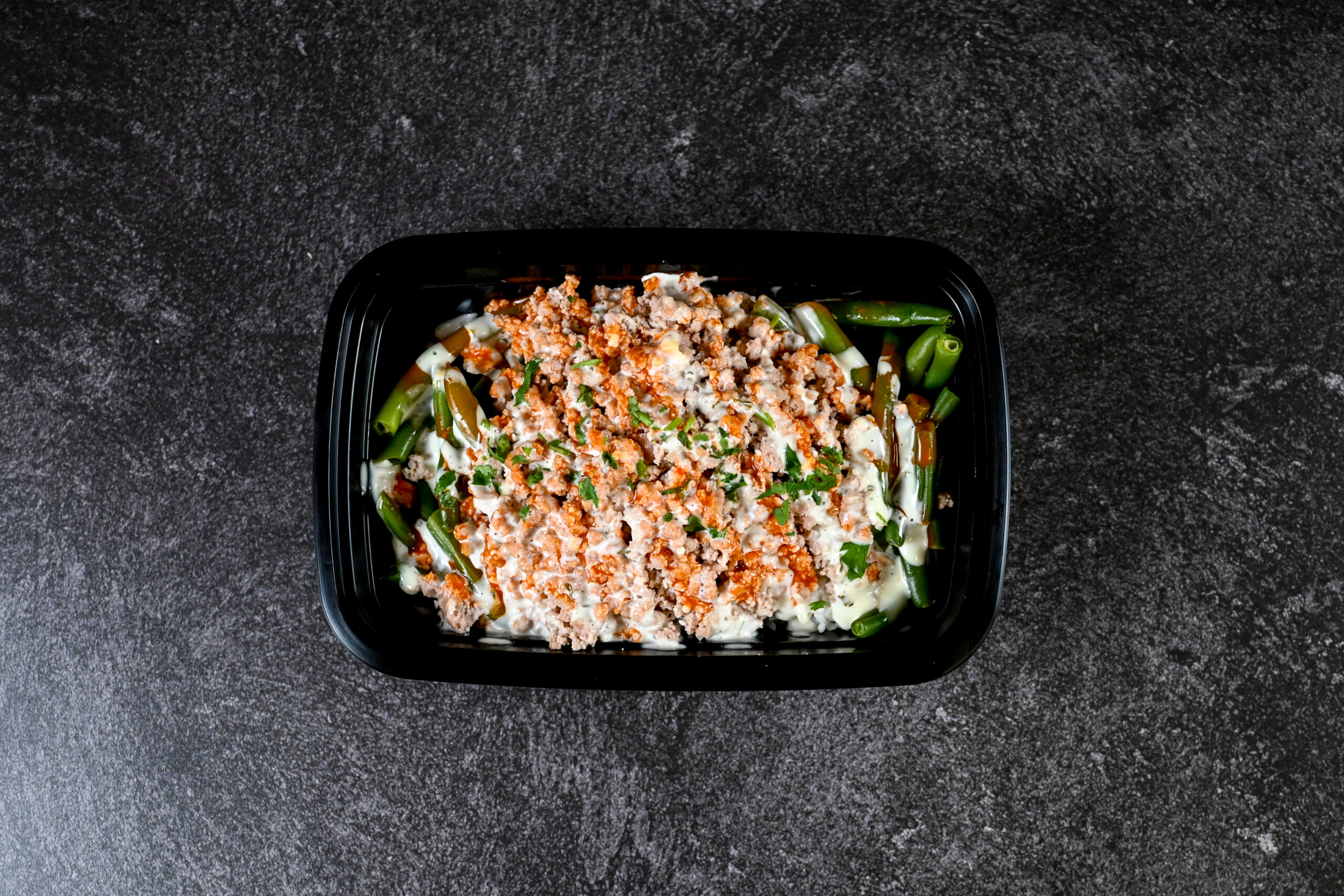 OUR LEAN GARLIC BUTTER TURKEY WITH HOUSE CREAMY BUFFALO SAUCE, GREEN BEANS, AND JASMINE RICE!