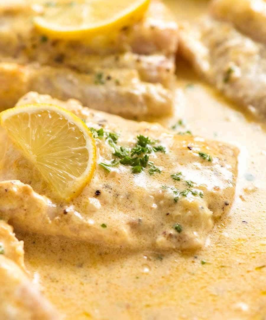 CREAMY LEMON DILL SAUCE SERVED OVER FLAKY WHITE FISH WITH RICE, GREEN BEANS, AND CHERRY TOMATOES.