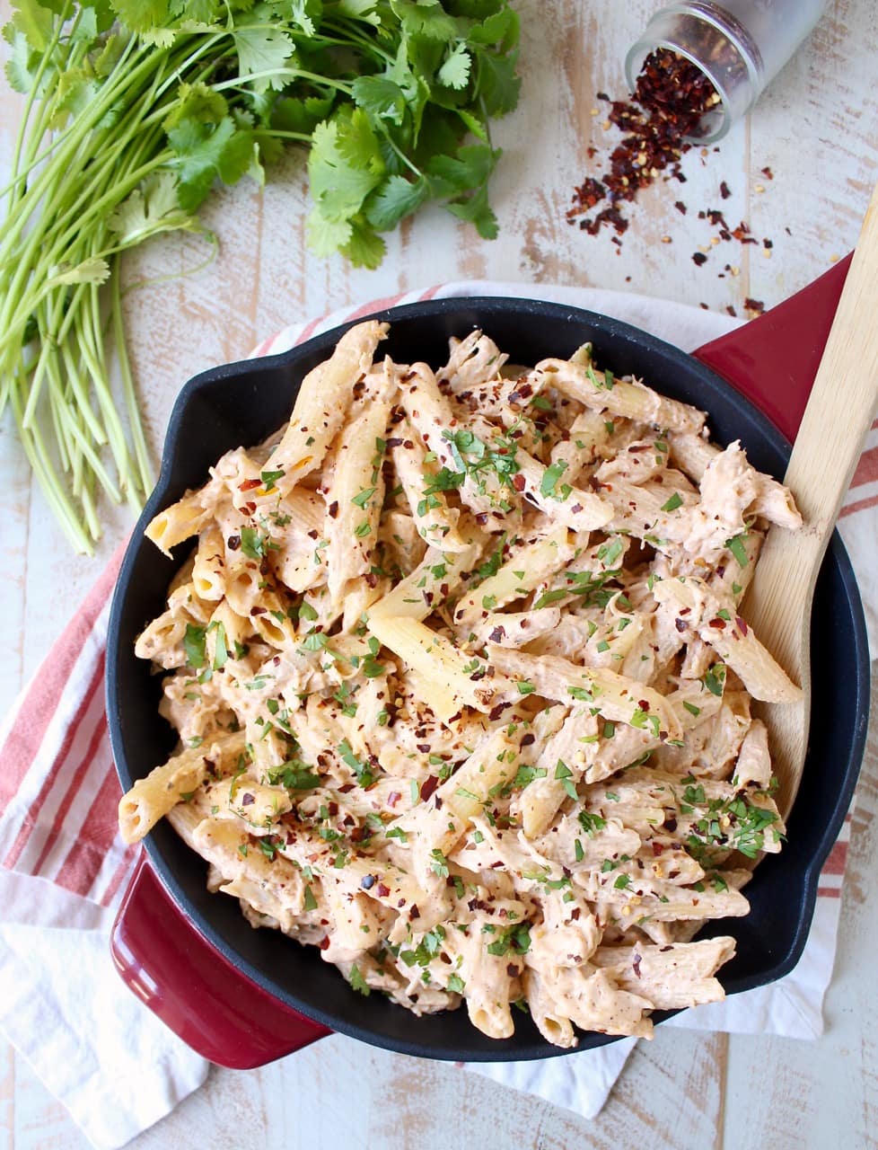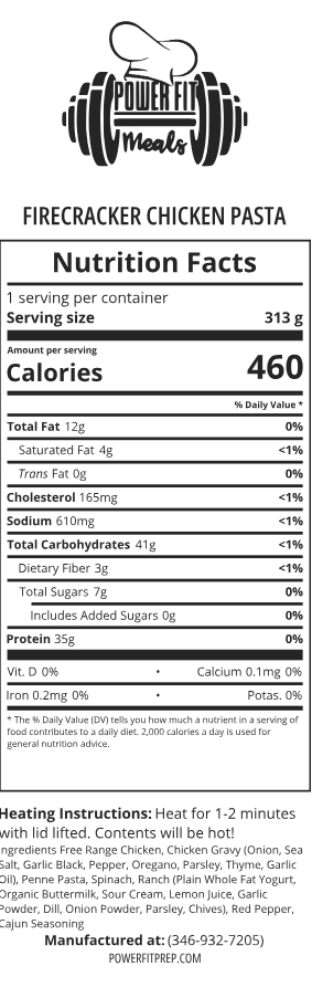 OUR FAMOUS SPICY FIRECRACKER SEASONING OVER SHREDDED CHICKEN, WITH PASTA AND SPINACH!