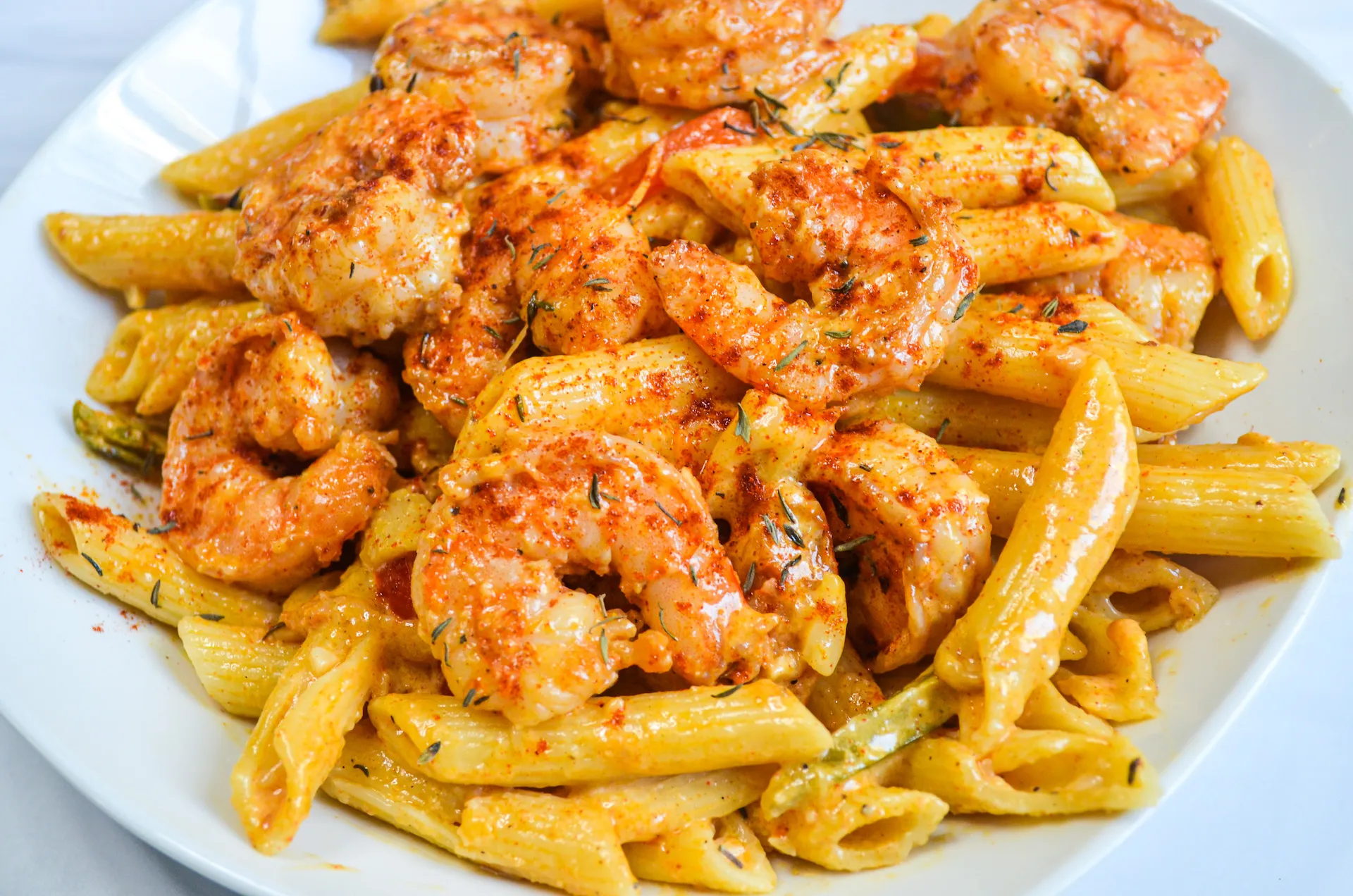 TOP SELLER! FRESH SAUTEED SHRIMP OVER PENNE PASTA & SPINACH WITH OUR CREAMY FIRECRACKER SAUCE!