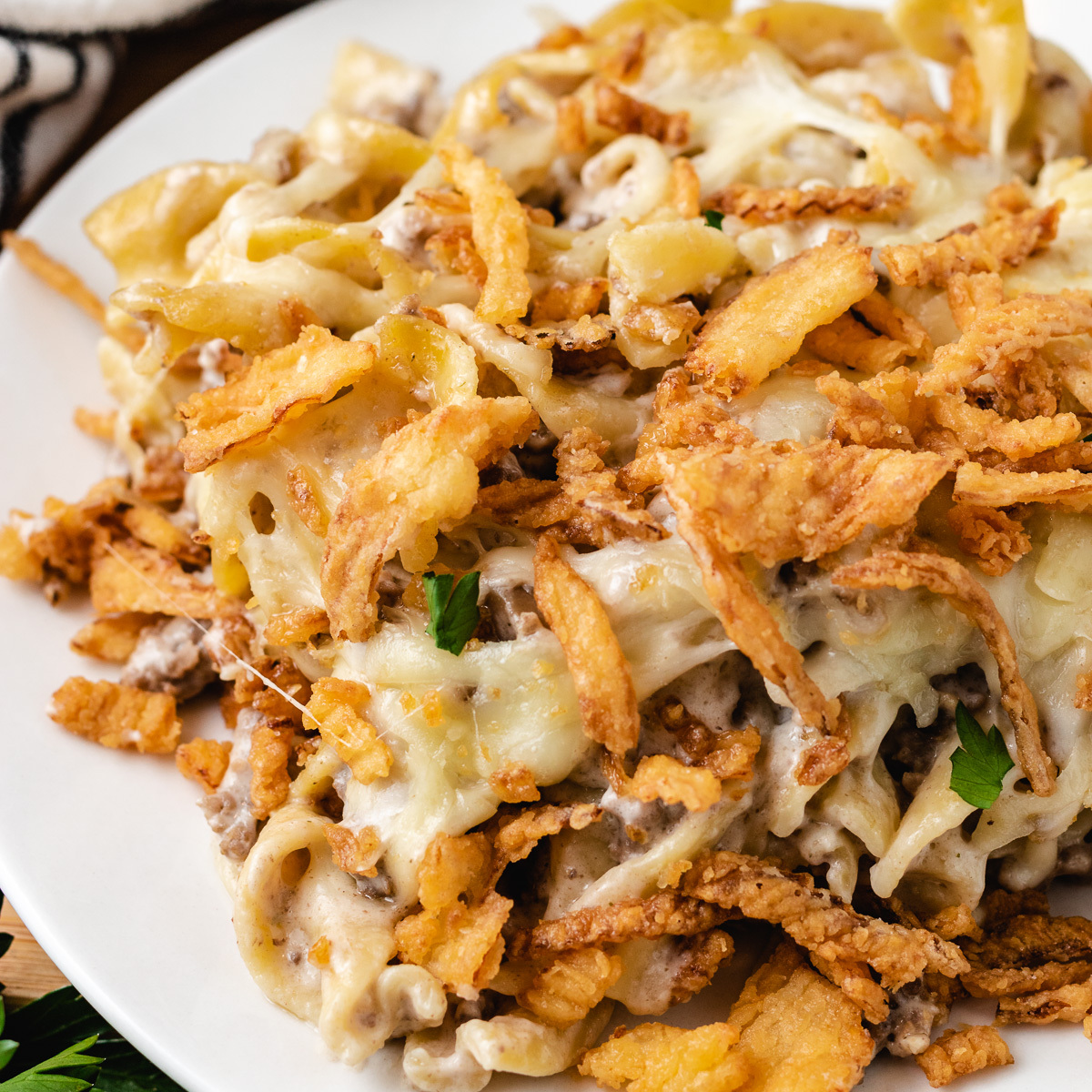 FRENCH ONION SAUCE OVER OUR FLAVORFUL ROAST WITH PASTA AND SPINACH TOPPED WITH PROVOLONE CHEESE AND CRISPY ONIONS!