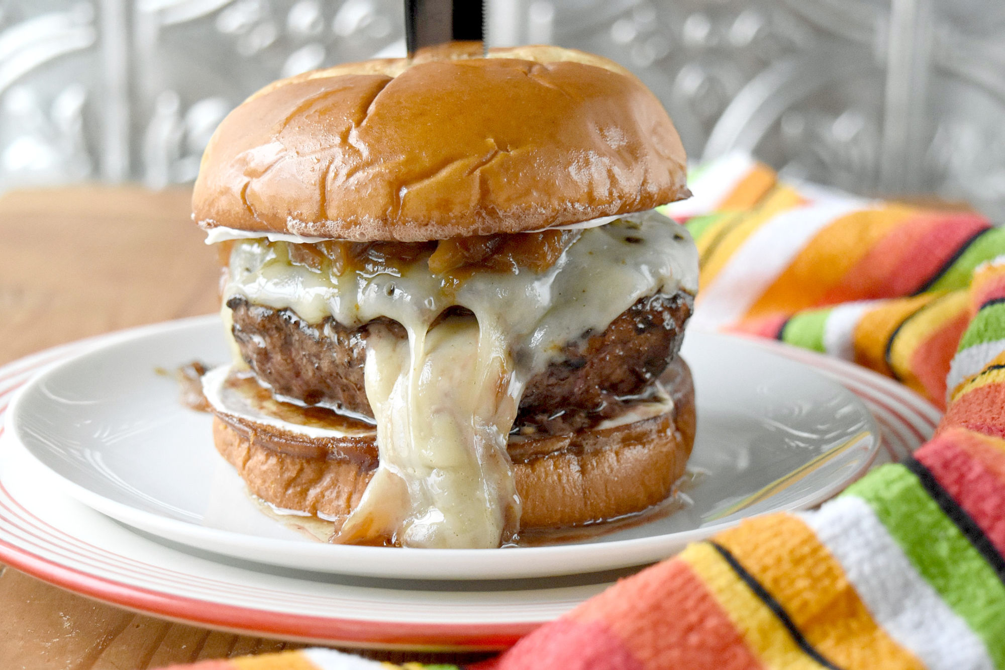 FRENCH ONION BEEF BURGER PATTY WITH SWISS CHEESE, SANDWICH THIN BUNS, SPINACH, AND AN ONION JAM. SERVED WITH A SIDE OF SWEET POTATOES!
