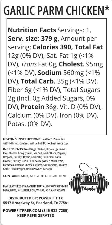 SLICED CHICKEN BREAST SERVED WITH JASMINE RICE, BROCCOLI, AND OUR GARLIC PARM SAUCE!
