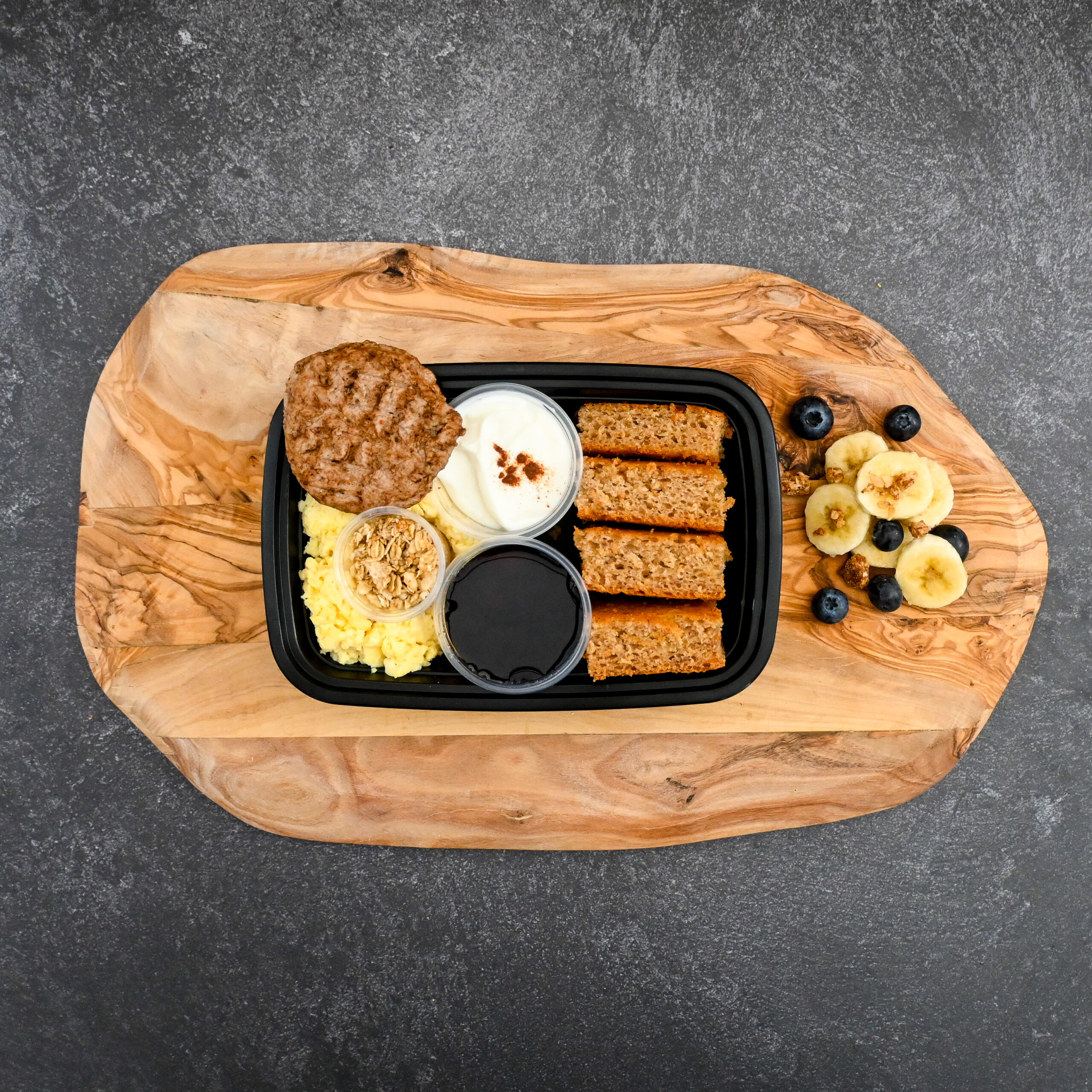 DELICIOUS PANCAKE BITES WITH GRANOLA TOPPING, GREEK YOGURT, TURKEY SAUSAGE, EGG CUPS AND SUGAR FREE SYRUP!