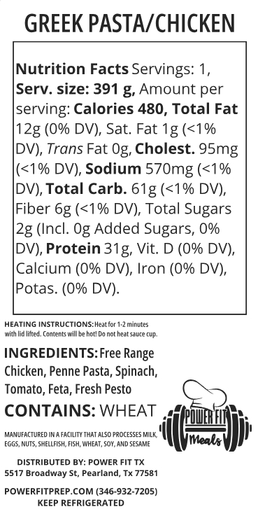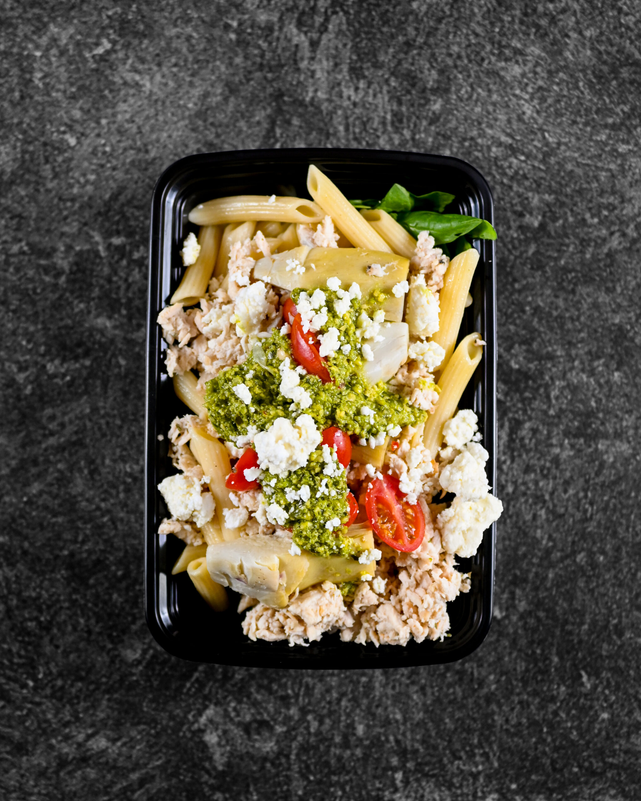 PENNE PASTA SERVED WITH CHICKEN, ARTICHOKE HEARTS, SPINACH, FETA, TOMATOES, AND PESTO SAUCE.