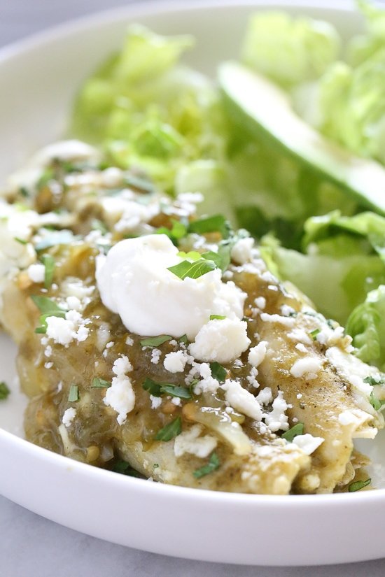SHREDDED CHICKEN BREAST MIXED WITH PICO! WRAPPED IN A HEALTHY TORTILLA AND TOPPED WITH CREAMY GREEN SAUCE AND MOZZARELLA CHEESE. SERVED WITH RICE, BLACK BEANS, AND FRESH CILANTRO.