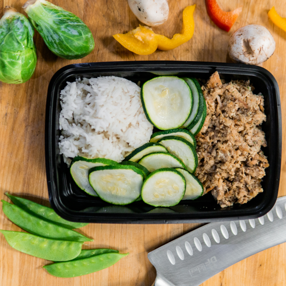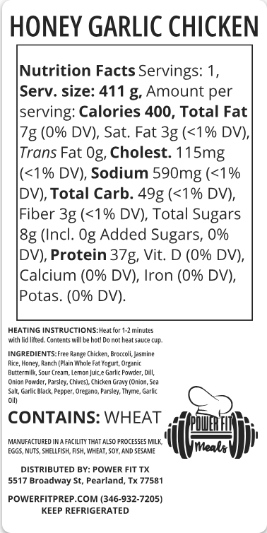 Sliced chicken breast mixed with olive oil, dry herbs, parmesan, and honey. Served with jasmine rice and broccoli.