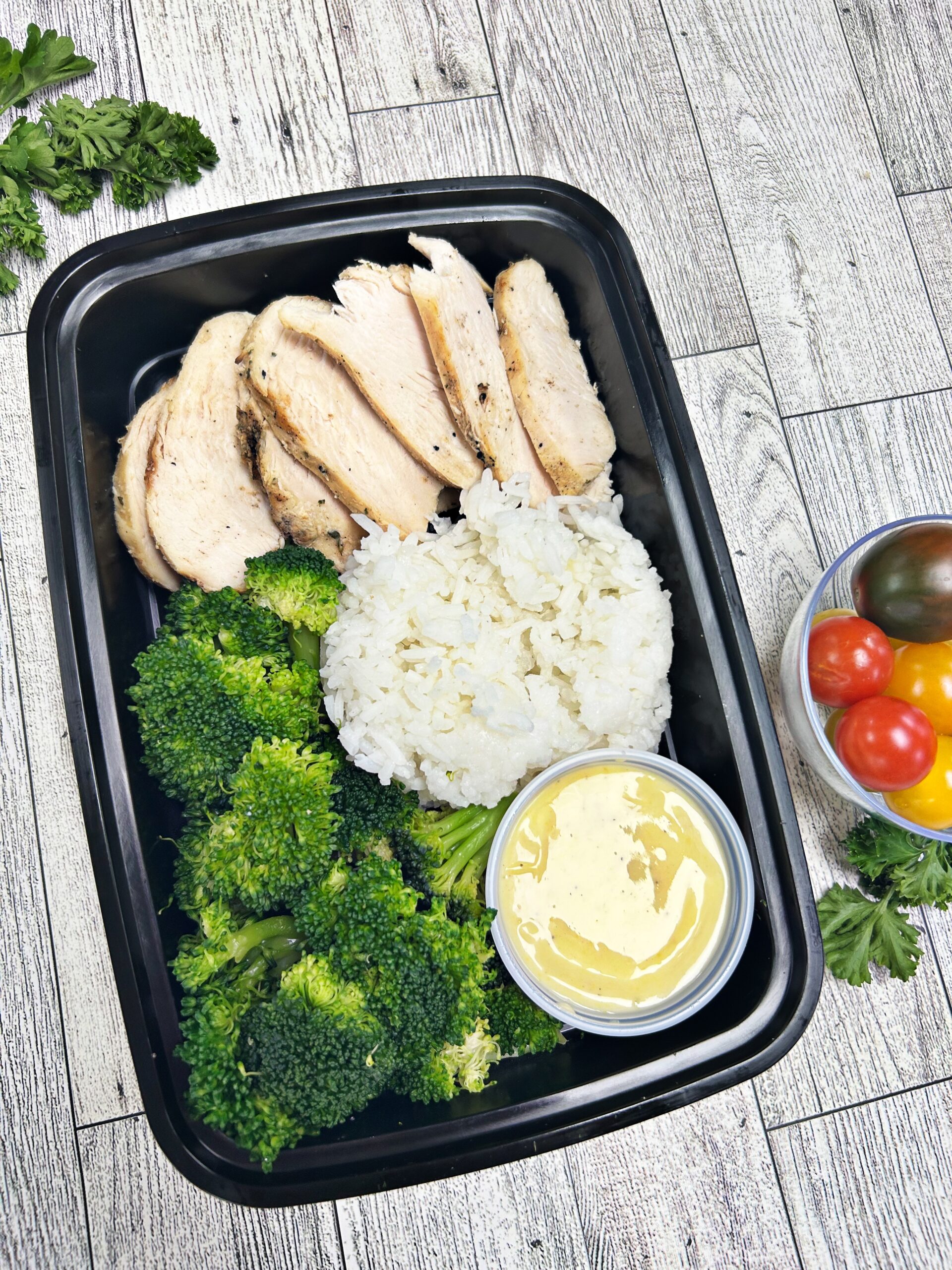 Sliced chicken breast served with jasmine rice, broccoli, and the famous honey mustard sauce!