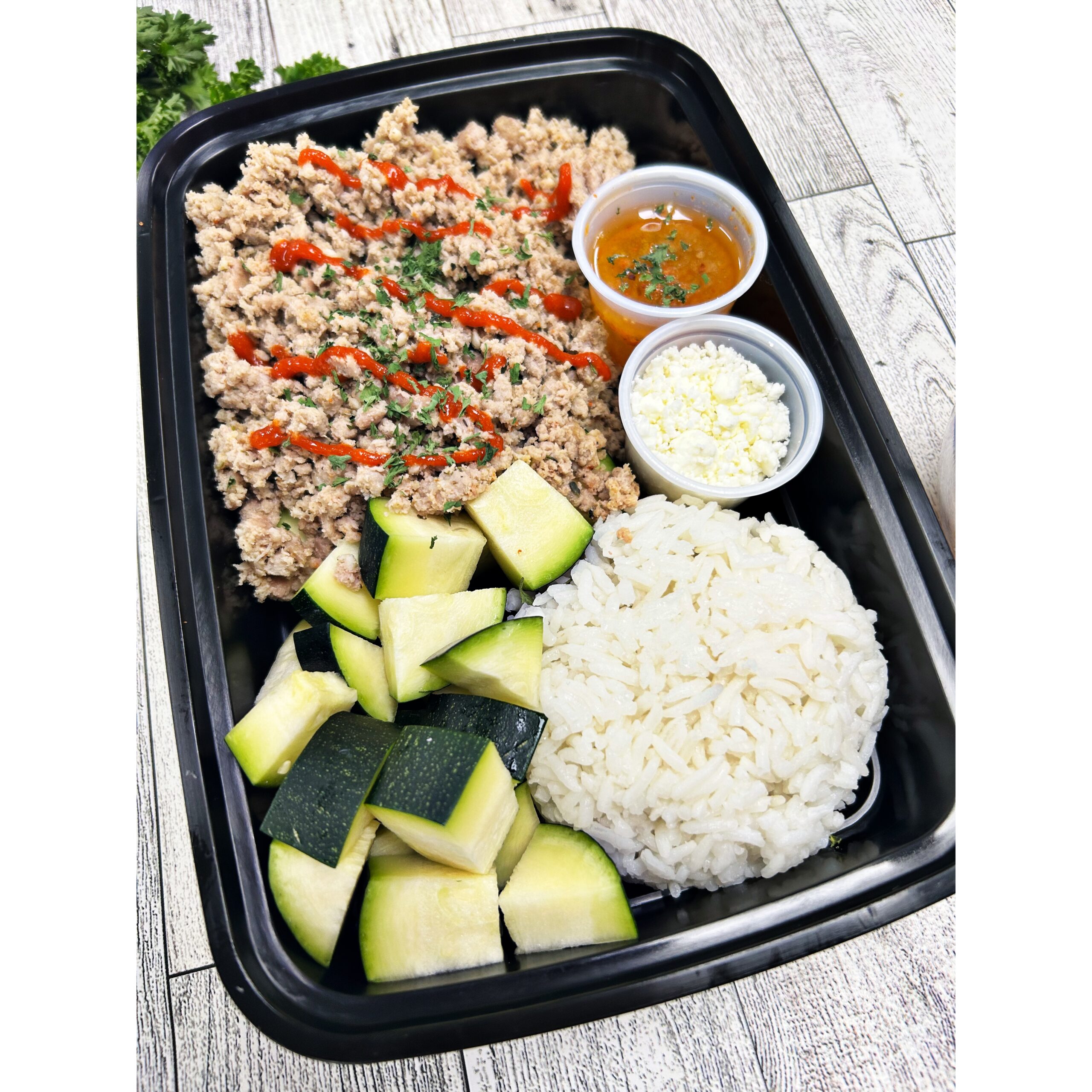 Lean ground turkey tossed with hot sriracha blend. Served with zucchini, Jasmine Rice, Spinach, Feta, Honey Sriracha Seasoning