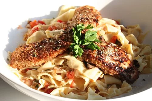 OUR YUMMY HOT HONEY SAUCE OVER OUR FLAKY WHITE FISH SERVED WITH PASTA AND BROCCOLI