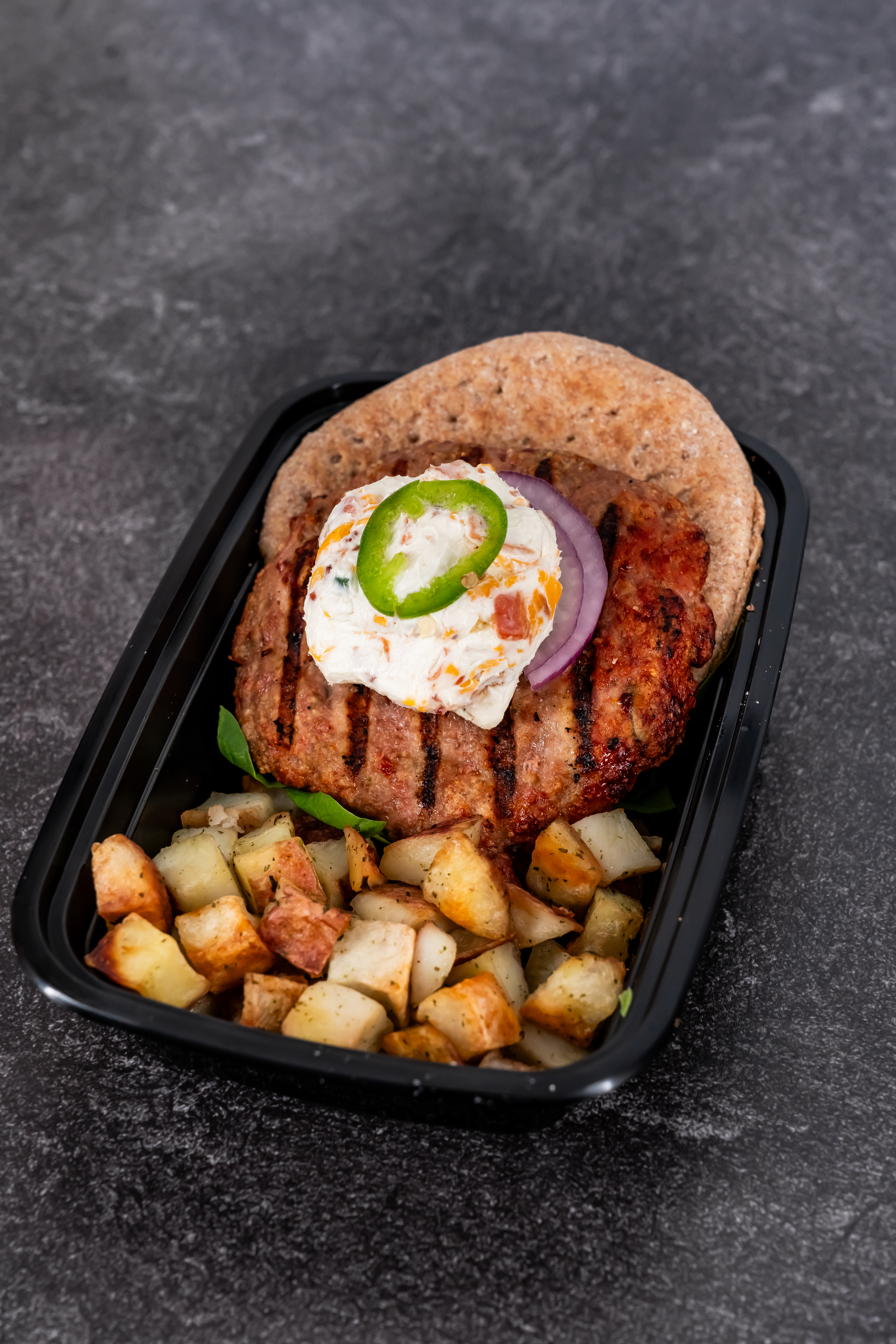 A JUICY TURKEY BURGER TOPPED WITH JALAPENO POPPER MIX SERVED WITH RED POTATOES, AND A THIN BUN! (HAS BACON)