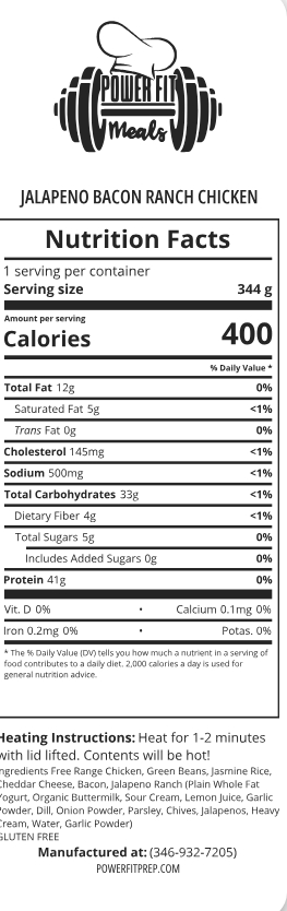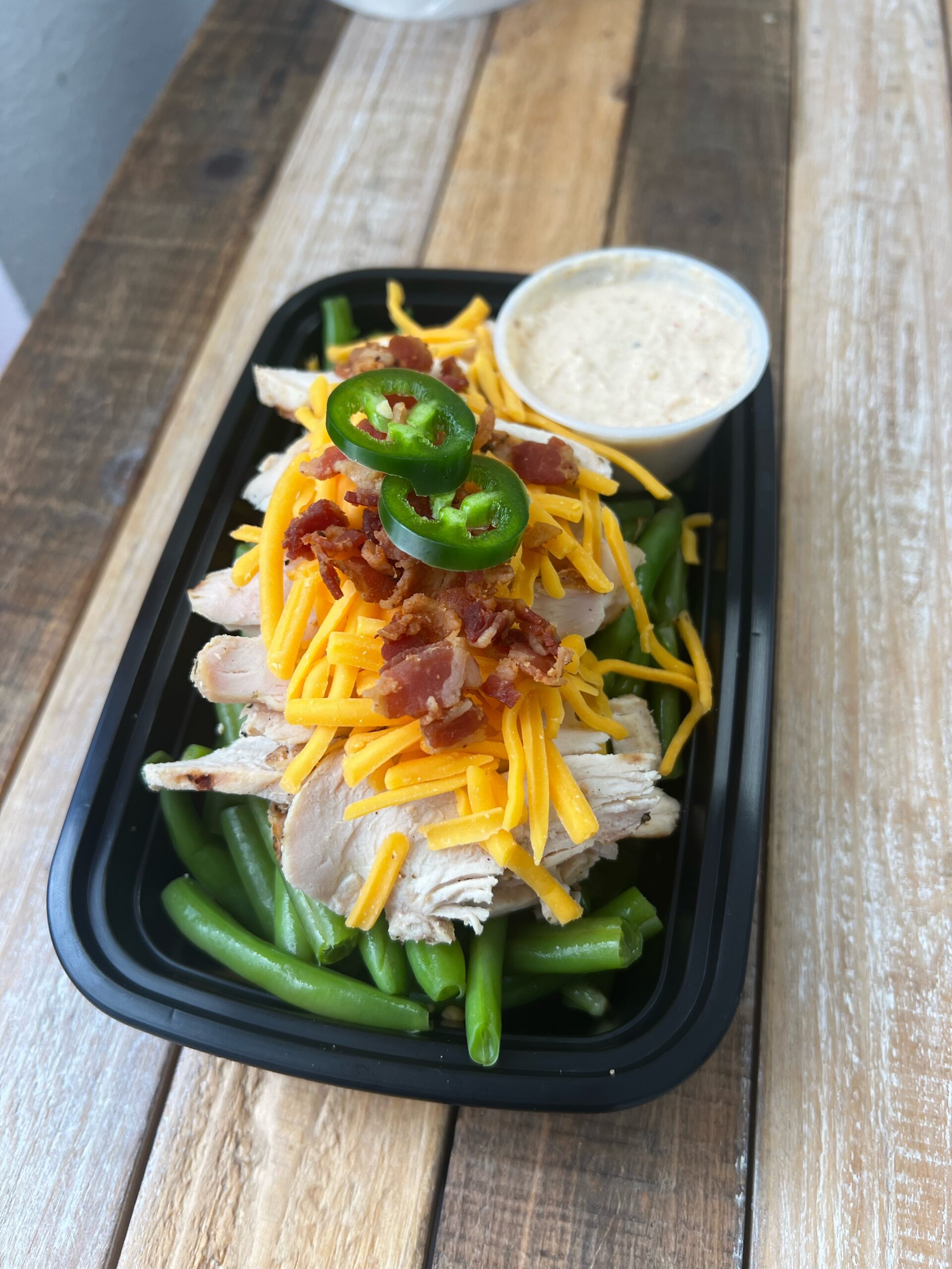 GRILLED CHICKEN SERVED OVER RICE AND GREEN BEANS. TOPPED WITH CHEDDAR, BACON, AND JALAPENO RANCH, YUM!