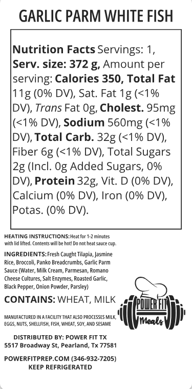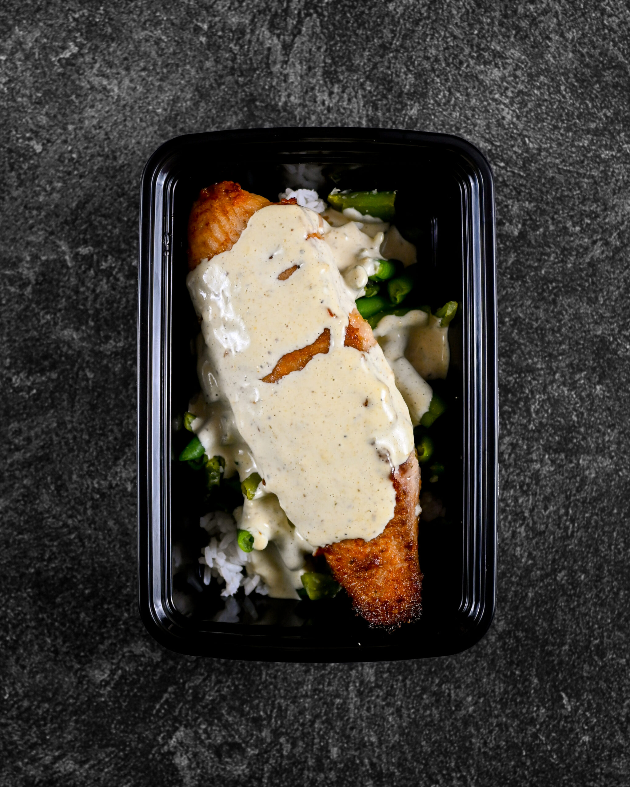 Sauteed tilapia served with jasmine rice, green beans, and garlic parm sauce