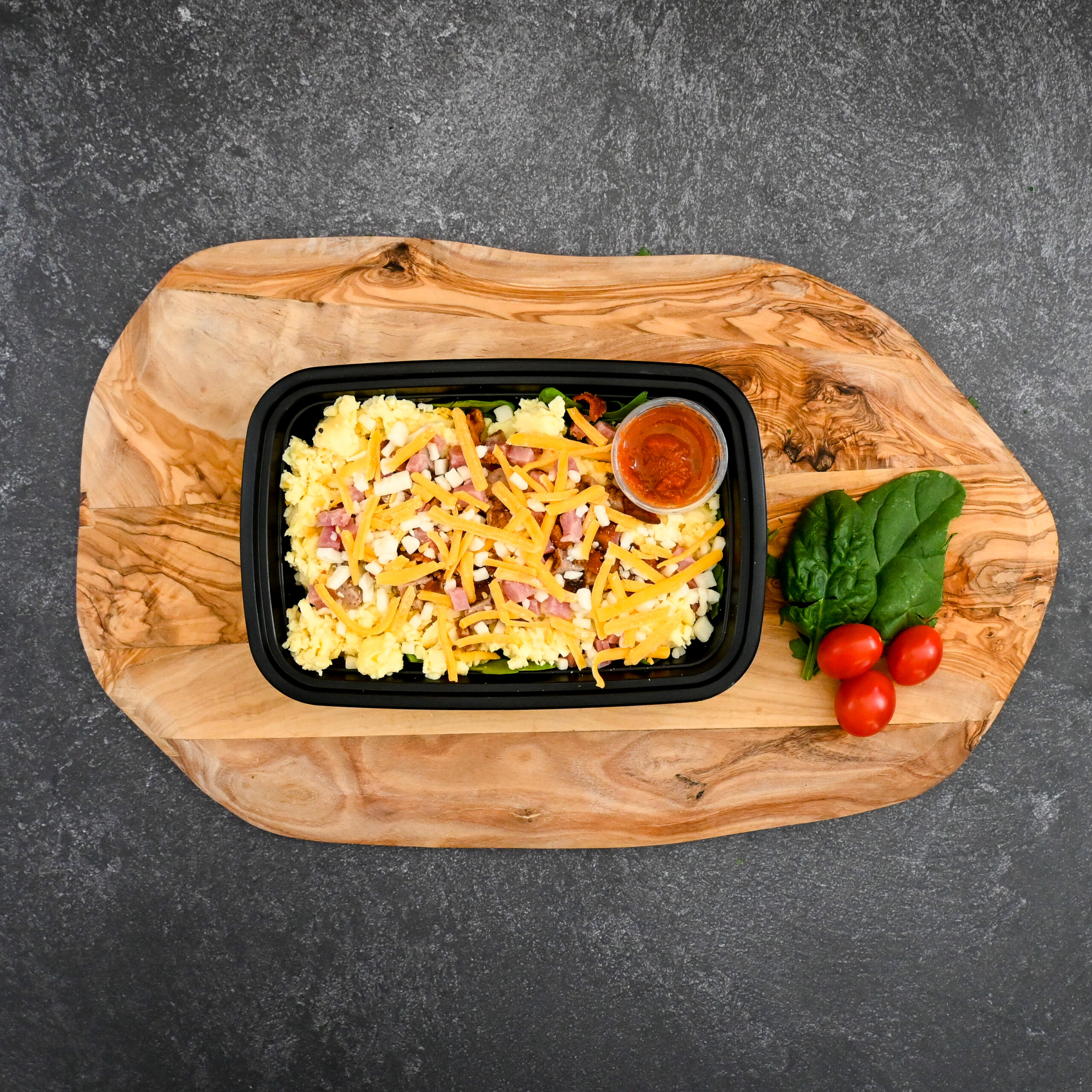 EGGS, TURKEY SAUSAGE, HAM, BACON, CHEDDAR, MOZZARELLA, SPINACH, AND SALSA! FULL ON FLAVOR NOT ON CARBS!