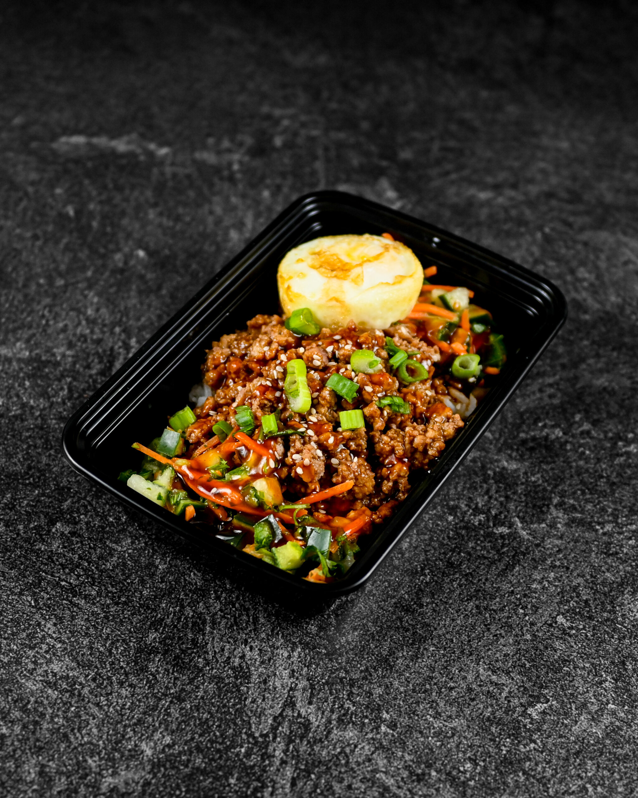 DELICIOUS! LEAN GROUND KOREAN BEEF WITH CUCUMBERS, CARROTS, FRIED EGG, AND RICE.