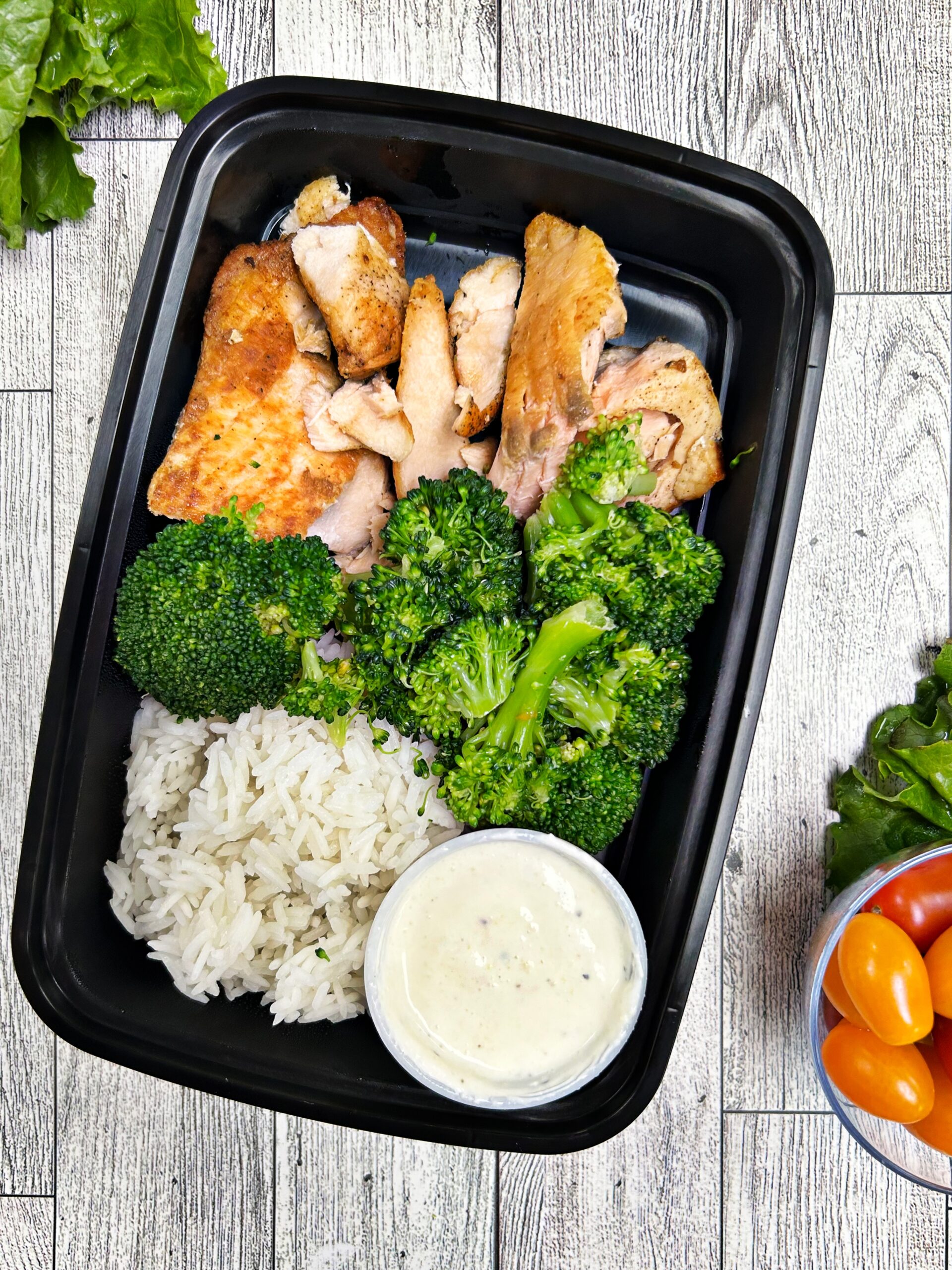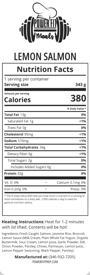 Fresh grilled salmon served with lemon sauce, broccoli, and jasmine rice