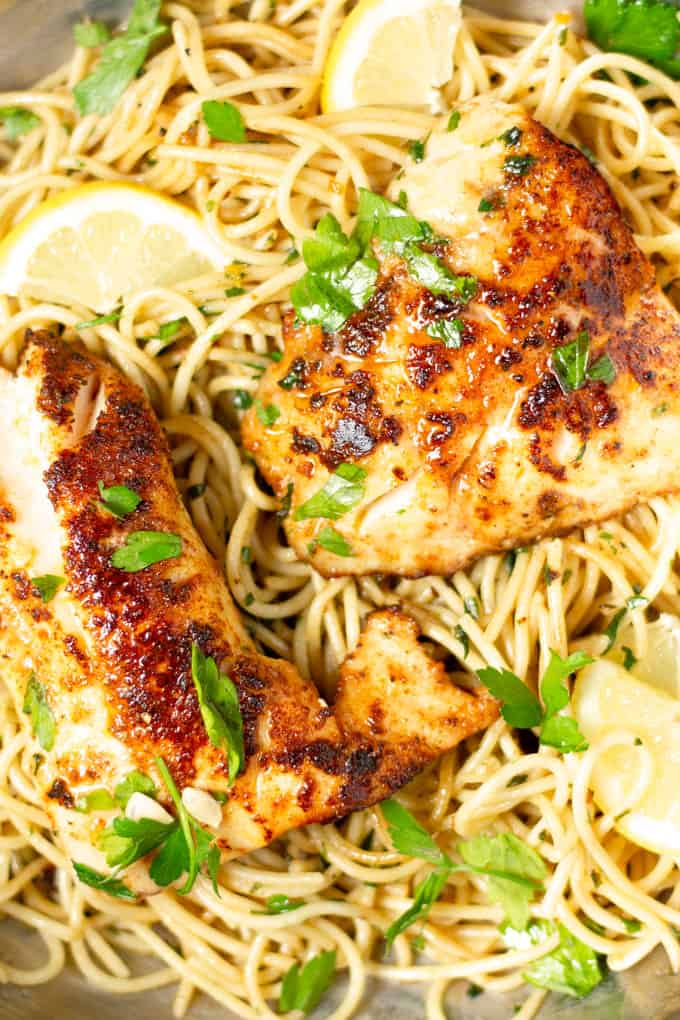 FLAKY WHITE FISH OVER PASTA AND SPINACH SERVED WITH OUR SIGNATURE LEMON SAUCE AND BROCCOLI