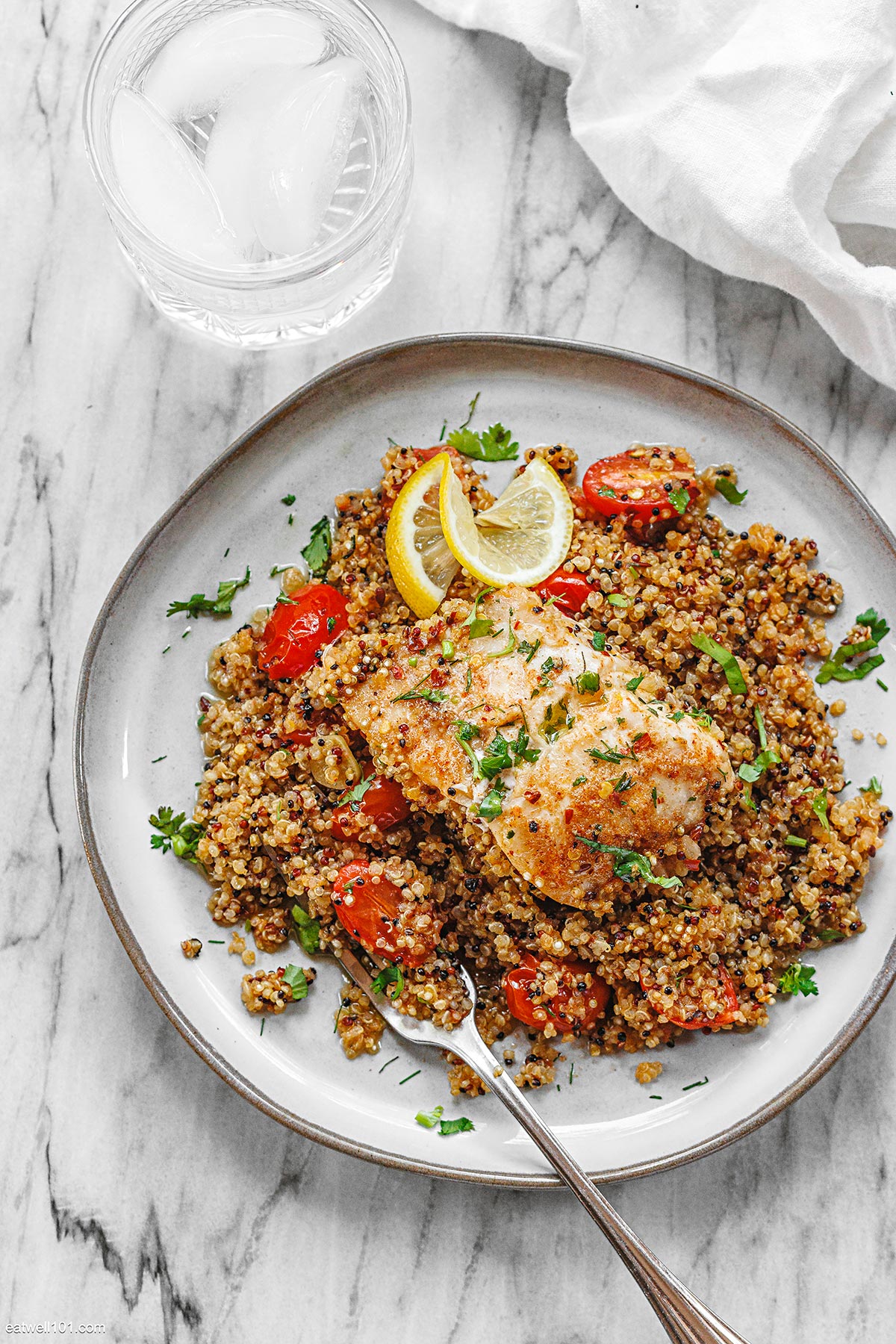 Our Lemon White Fish Quinoa Bowl features tender white fish drizzled with a zesty lemon sauce, served over fluffy quinoa with a vibrant medley of kale, bell peppers, and carrots. A light, nutrient-packed meal bursting with fresh flavor! 🍽️✨