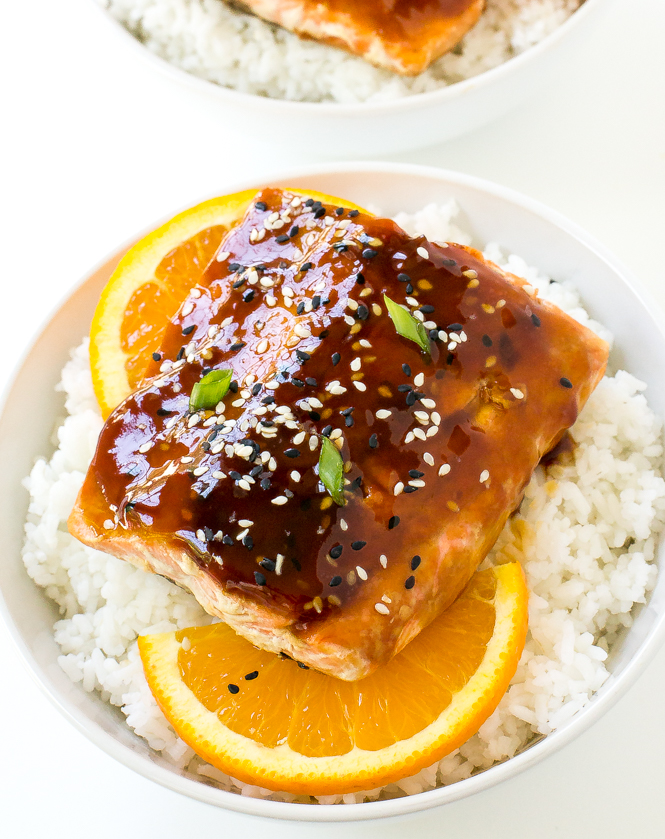 SWEET AND TANGY ORANGE SAUCE OVER DELICIOUS GRILLED SALMON SERVED WITH RICE AND GREEN BEANS