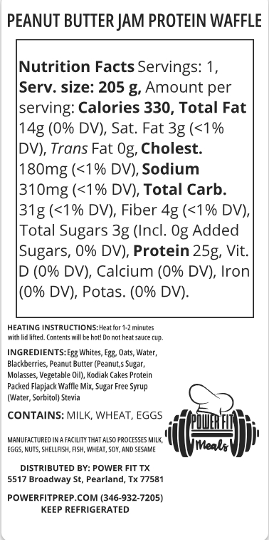 PROTEIN PACKED WAFFLES TOPPED WITH A PEANUT BUTTER AND SUGAR FREE BLACK BERRY JAM DRIZZLE!