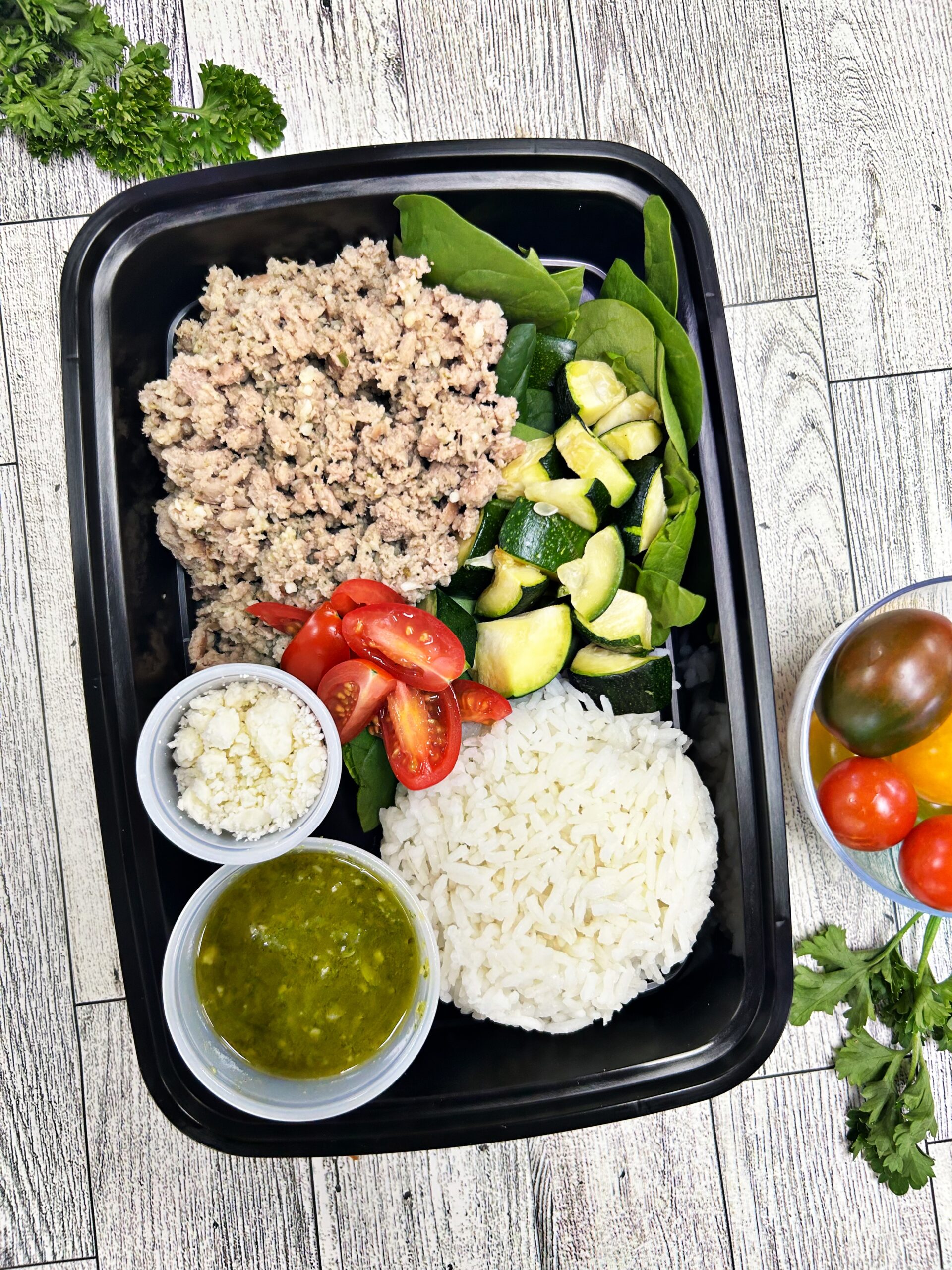 Lean ground turkey with jasmine rice, zucchini, pesto, and baby tomatoes