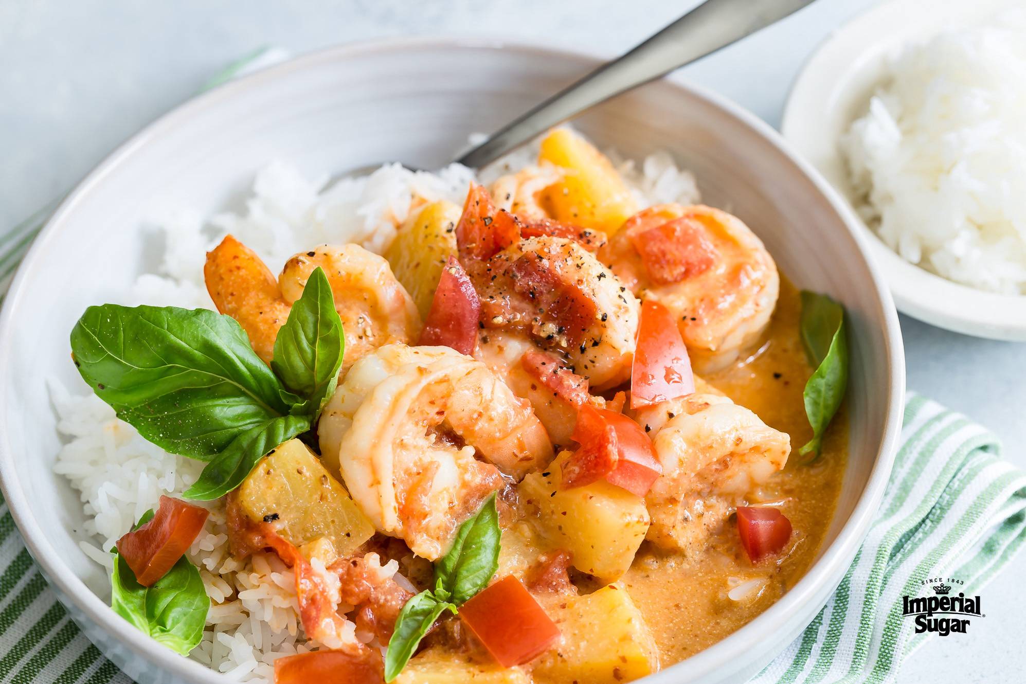 SHRIMP AND TURKEY SAUSAGE SIMMERED WITH PINEAPPLE CURRY SAUCE SERVED WITH JASMINE RICE, CARROTS AND GREEN BEANS